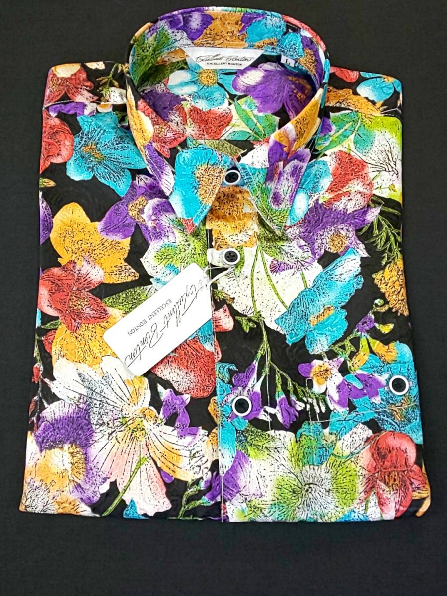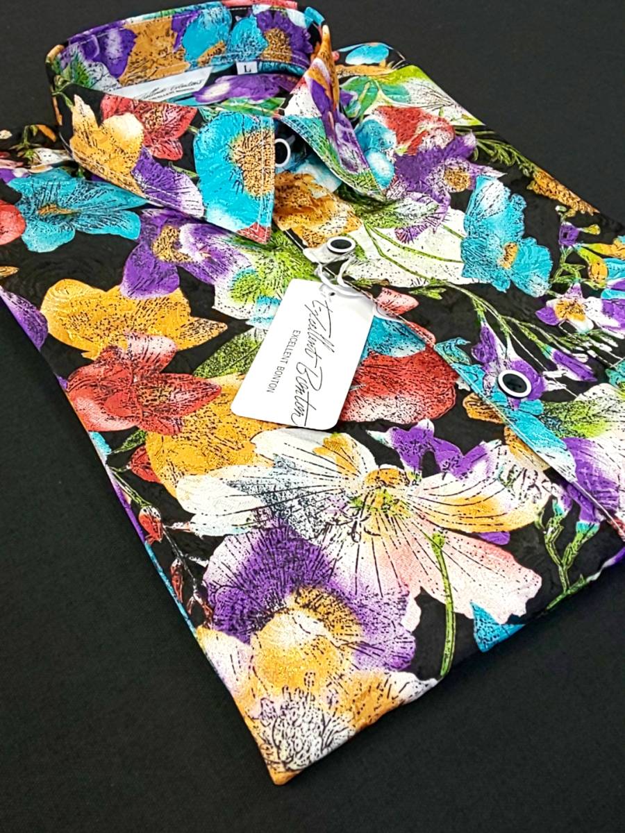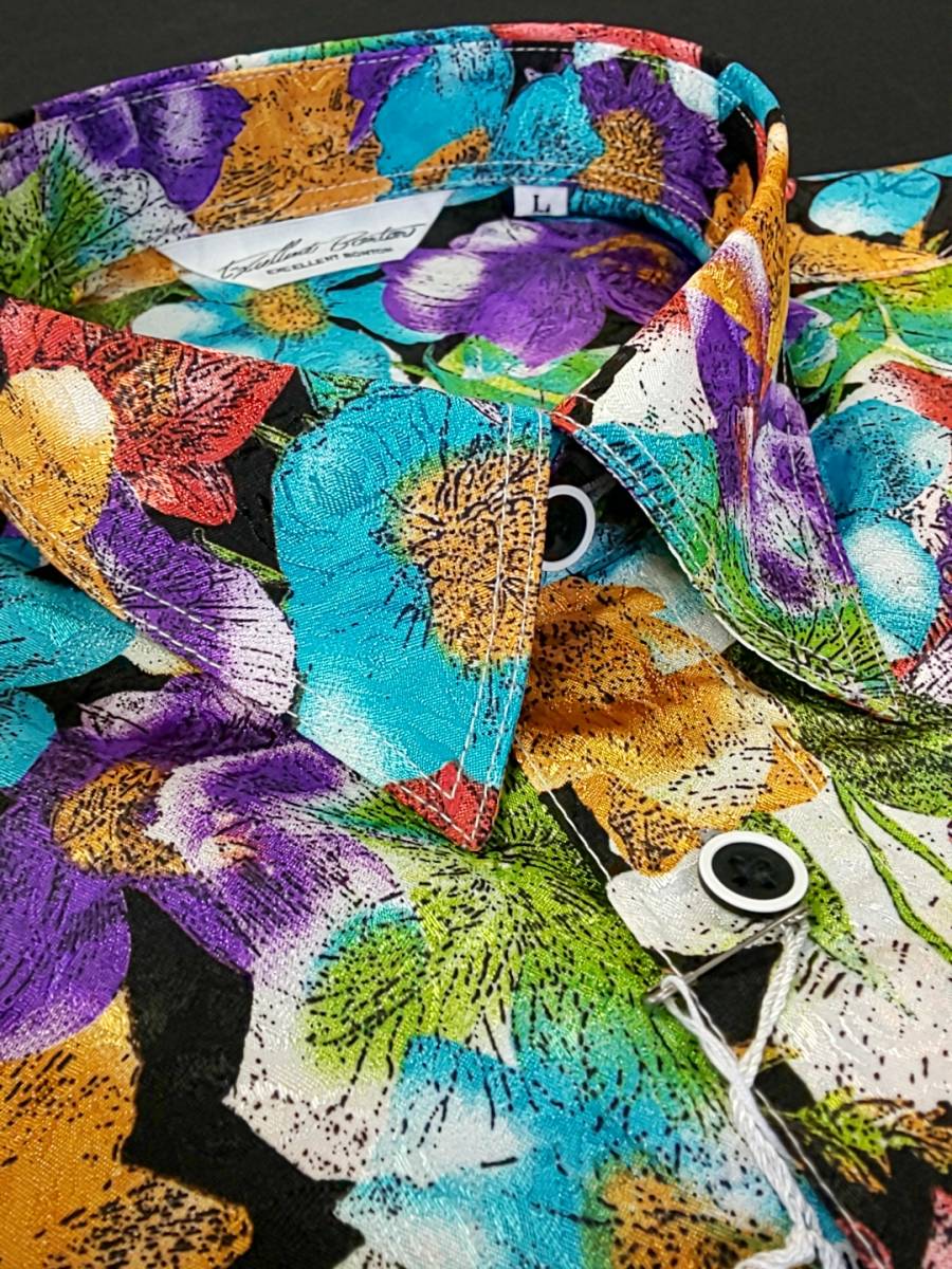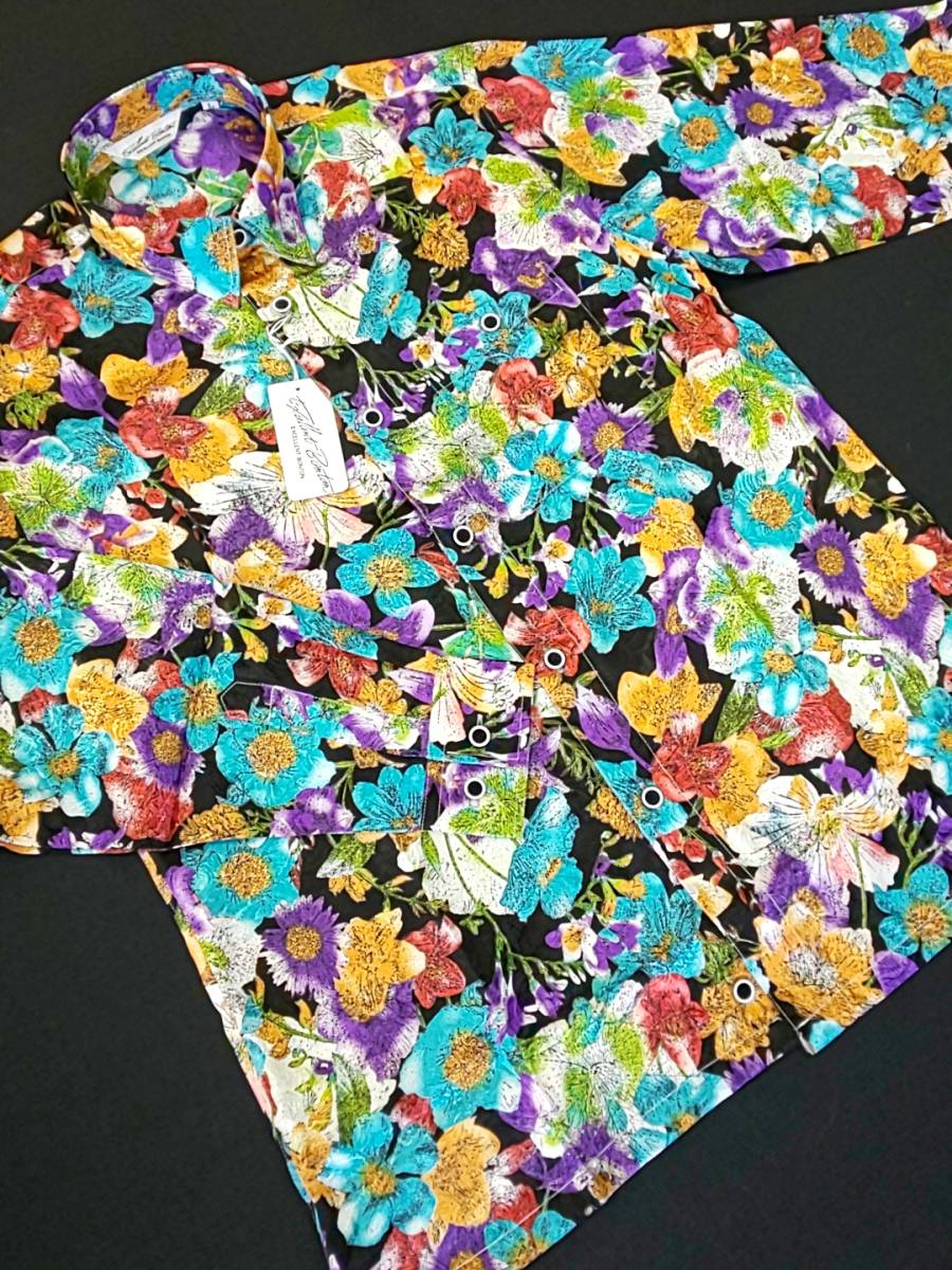 黒ベースの光沢あるジャガード織り地にカラフルな大きな花柄プリントがインパクトある商品です。