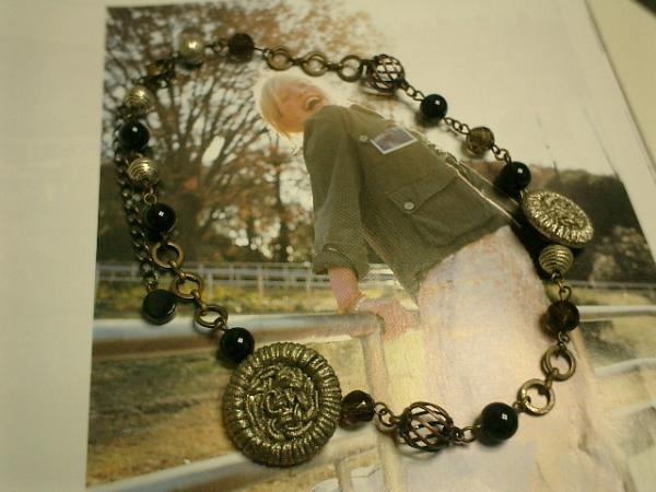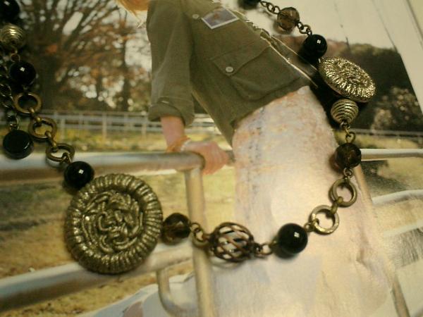 シックなオニキスとスモーキークォーツと薔薇のボタンでネックレスを作りました♪神秘的な雰囲気でこれからの季節にぴったりです。オニキスは8ミリの丸玉でスモーキークォーツは8ミリの丸カット玉です。間にメタルビーズやチェーンをつないで個性的です。薔薇のボタンは20ミリと24ミリです。シックなお色でまとめていますので合わせやすいと思います。シンプルで飽きのこないいつまでも着けられるデザインを考えて作りました!ネックレスの長さは38センチ+アジャスター9センチで最長47センチ位です。間に丸カンを使っていますので短くチョーカー風にも着けて頂けます。ロンドンっぽい雰囲気なのでパンクのお好きな方にも!お揃いのブレスレットも出品しています。ハンドメイドをご理解頂いてノークレーム、ノーリターンでお願いします