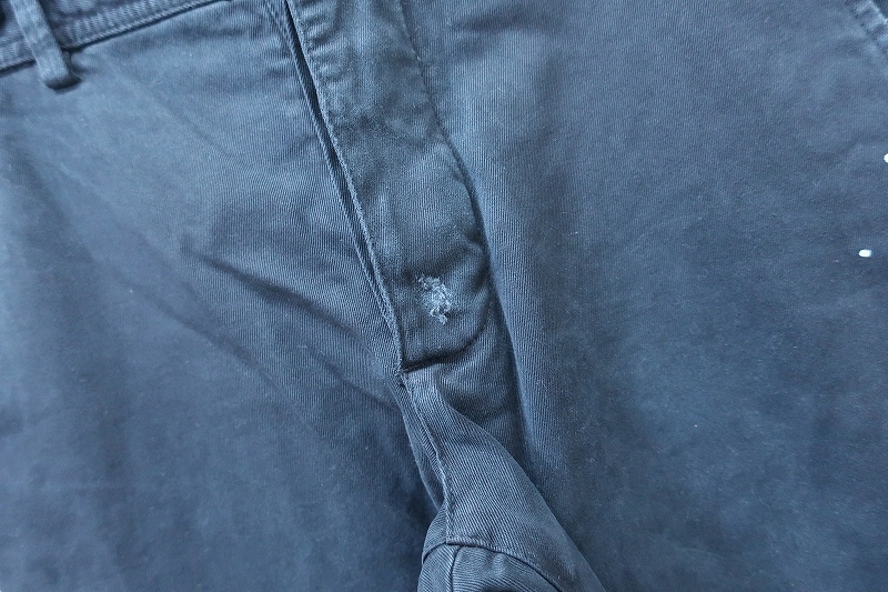 股に1箇所の破れ、正面の左ポケット、両バックポケットの周りと、