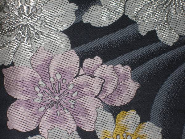 なお、帯柄左上に無地で出ているところは裏無地で、柄と柄の間に出ているところは手先と前太鼓のあいだの無地部分です。六通柄です。金銀糸が多用されているためストロボの照りで、しろぽく写っている部分があります。