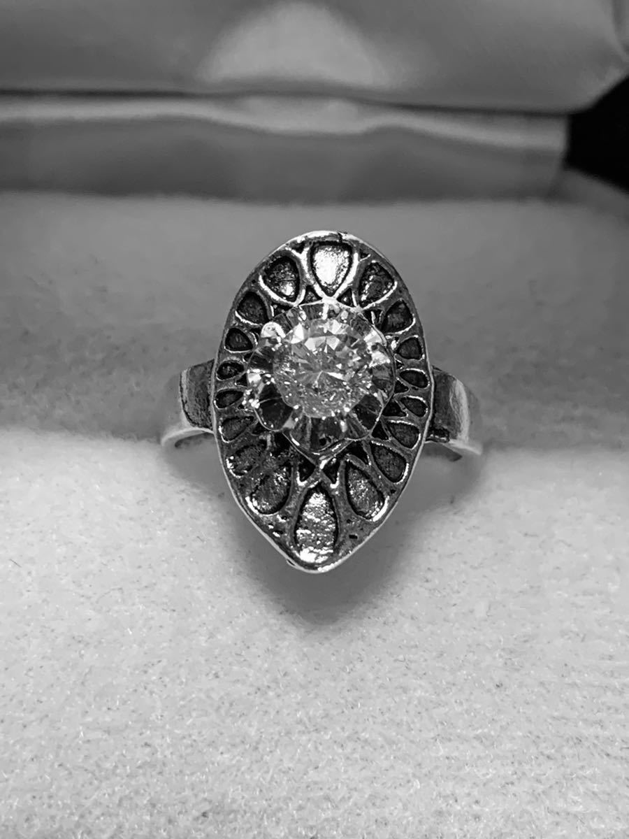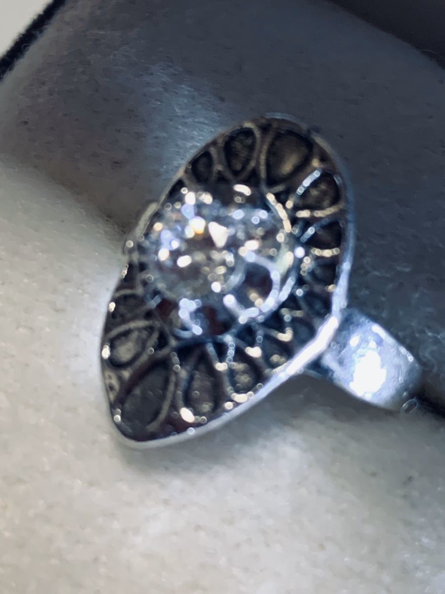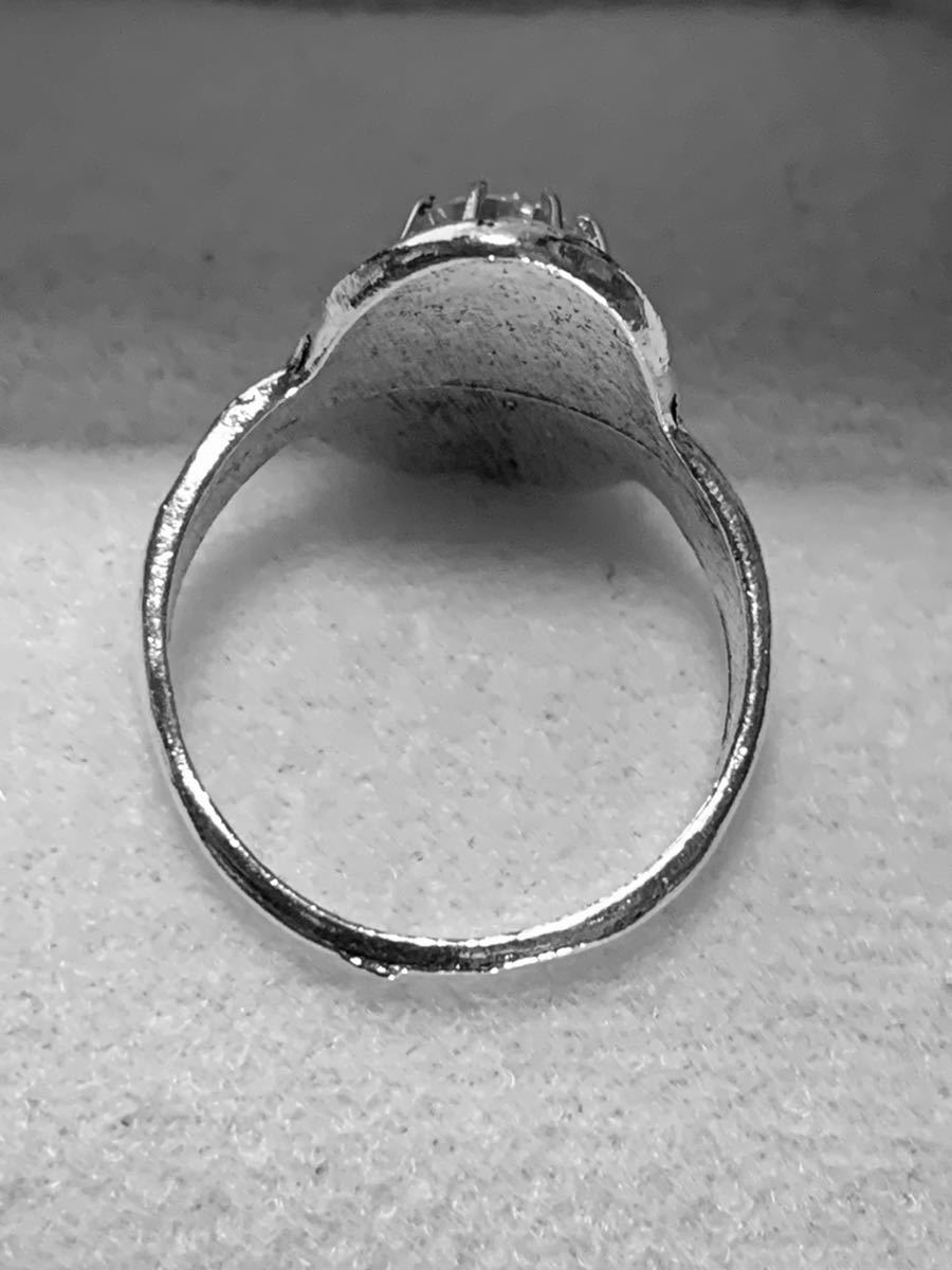 シルバーカラー、ジルコニアのデザインリングです、大きなジルコニアの輝きが、とても美しいリングです、サイズは19×11ミリ、リングは12号です