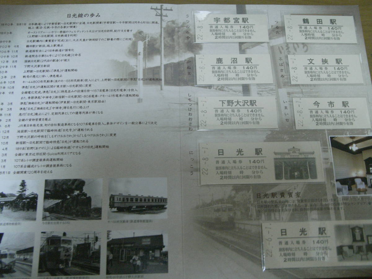 日光線全線開業120周年記念入場券 2010.8.1 JR東日本大宮支社●宇都宮・鶴田・鹿沼・文挟・下野大沢・今市・日光駅硬券入場券