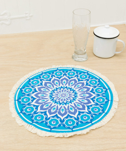 チャイハネ曼荼羅フリンジ付きラウンドプレイスマット ランチョンマット ブルー