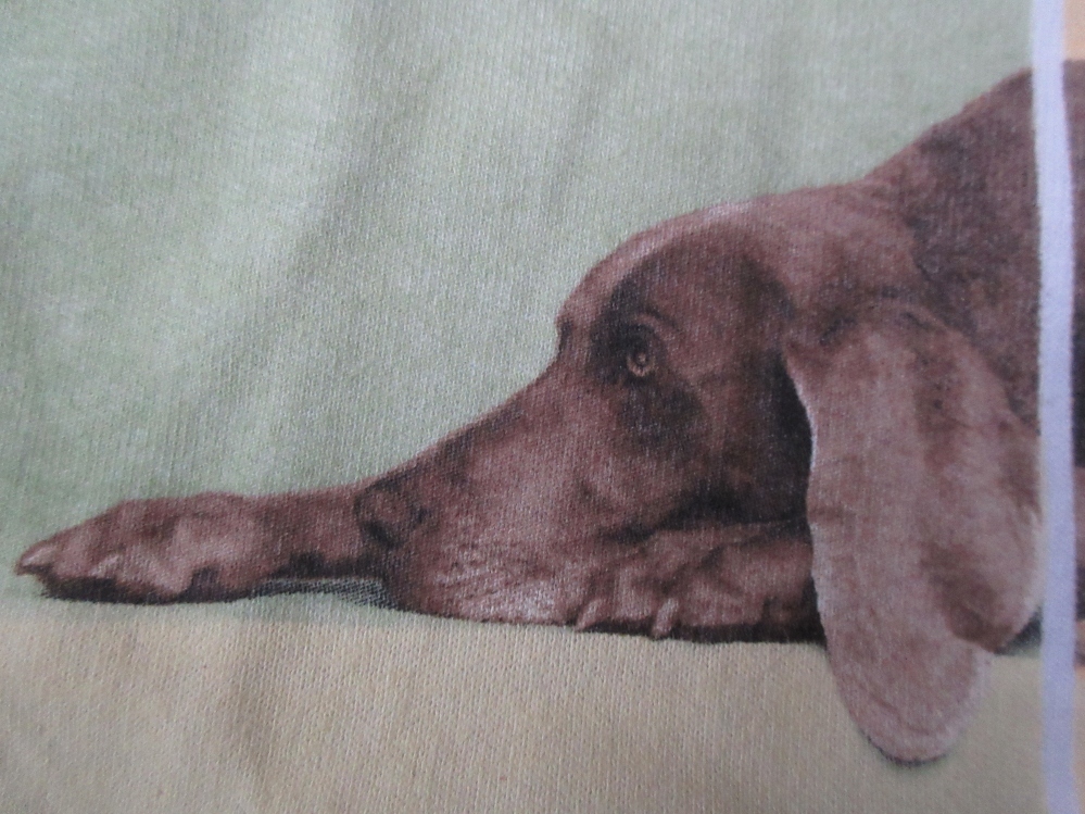 1943年に、アメリカ・マサチューセッツ州・ホリヨークに生まれ、1960年代後半からアーティストとしての活動を開始し、1970年代に、パフォーマンス、ビデオ、ドローイングといった表現手段を用いたコンセプチュアル・アーティストとして世界中から注目を集めた、アメリカのコンテンポラリー・アートを代表する写真家〔William Wegman(ウィリアム・ウェッグマン)〕氏の、Tシャツ表面に、作家生活においてもっとも重要な位置を占める、愛犬の「ワイマナラー犬(Weimaraner)」の「MAN RAY(マン・レイ)」のフォトが施された、〔オールド・FOTOFOLIO製・LYING DOG・フォト・Tシャツ〕になります。