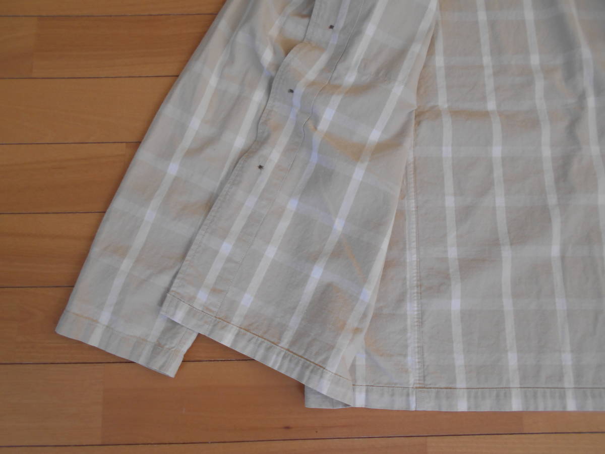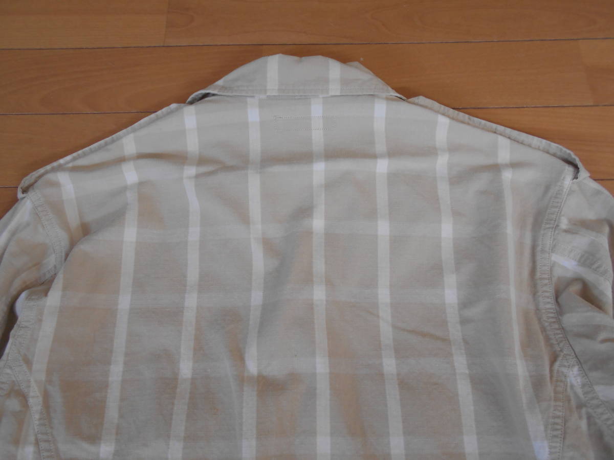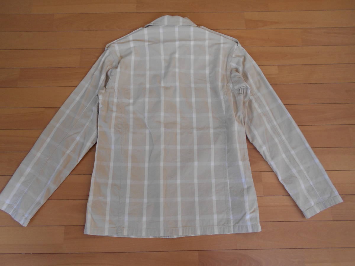 開襟ラペル裏にもボタンを付けたベージュ系の大きなチェックジャケットになってます。