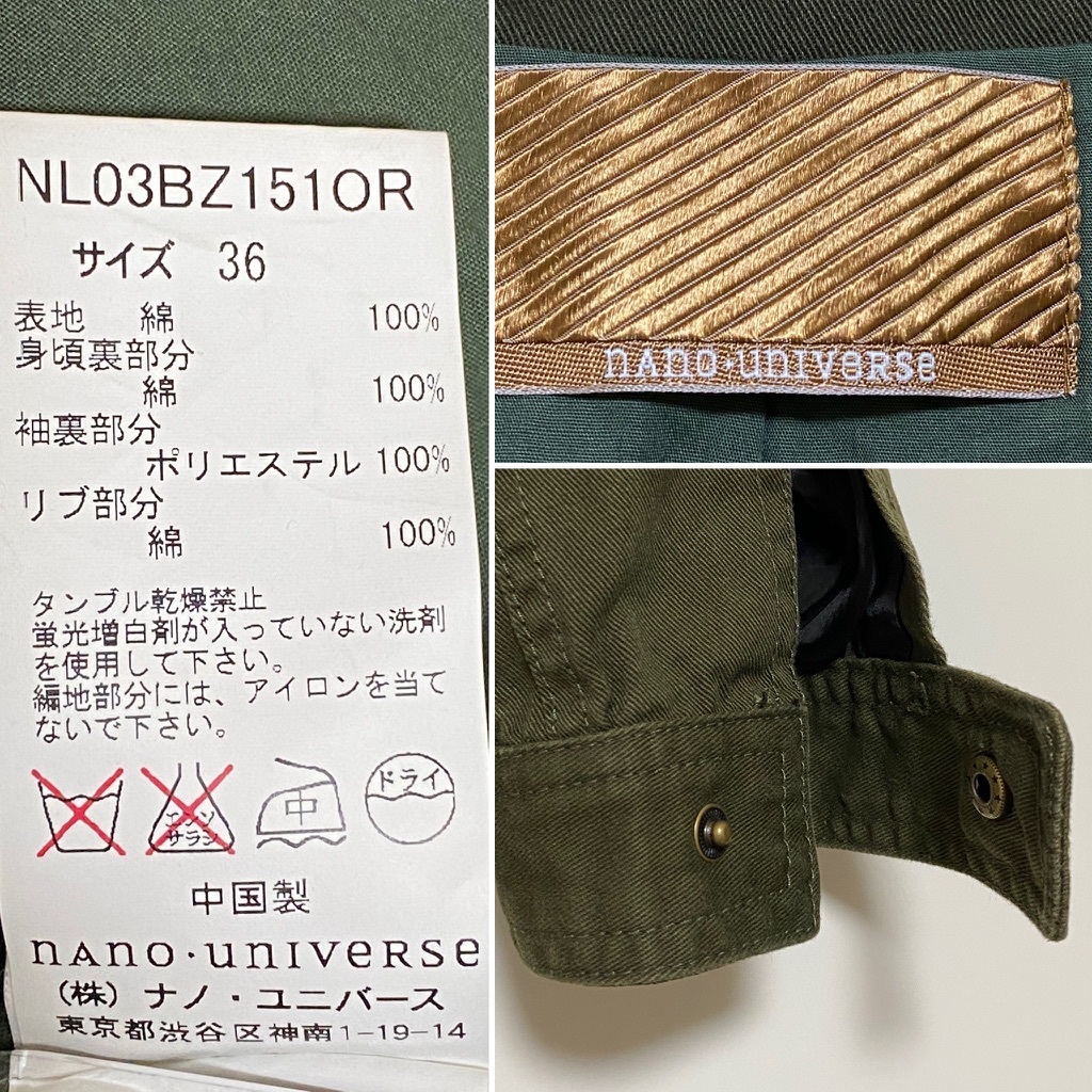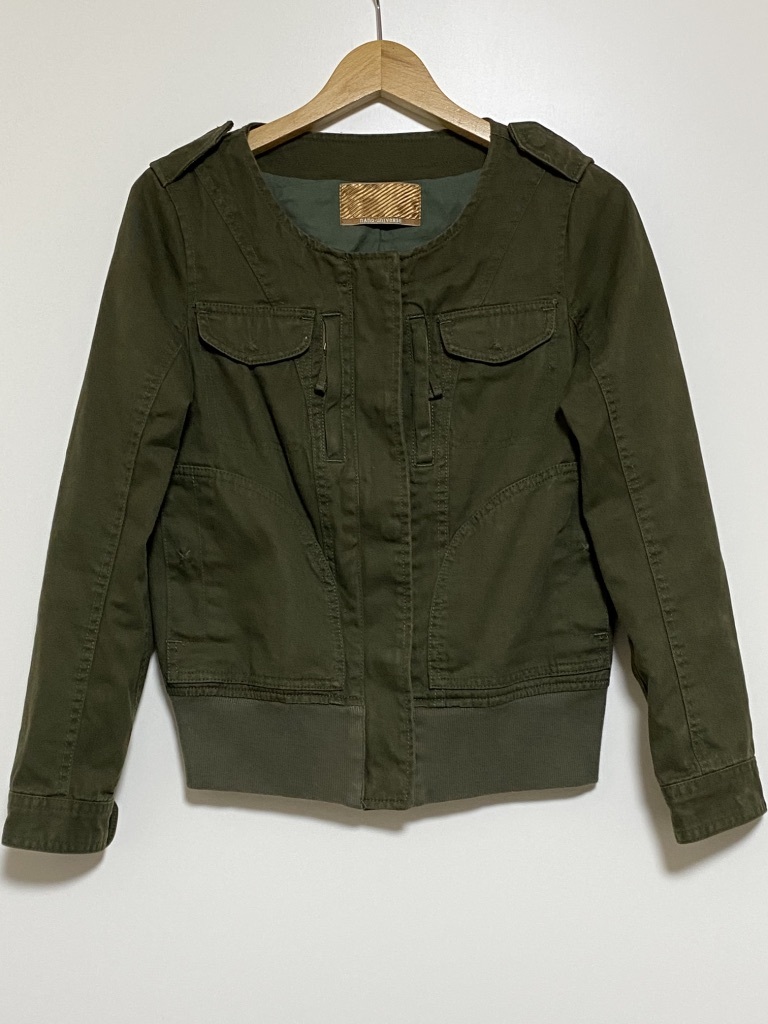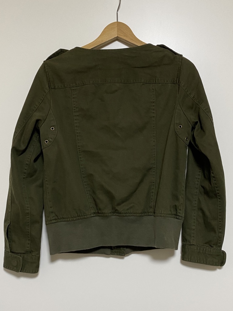 ★ nano・universe レディース ミリタリー調 ノーカラージャケット 36 カーキ 緑 裾リブ ショート丈 ライトアウター 4ポケット 春 秋