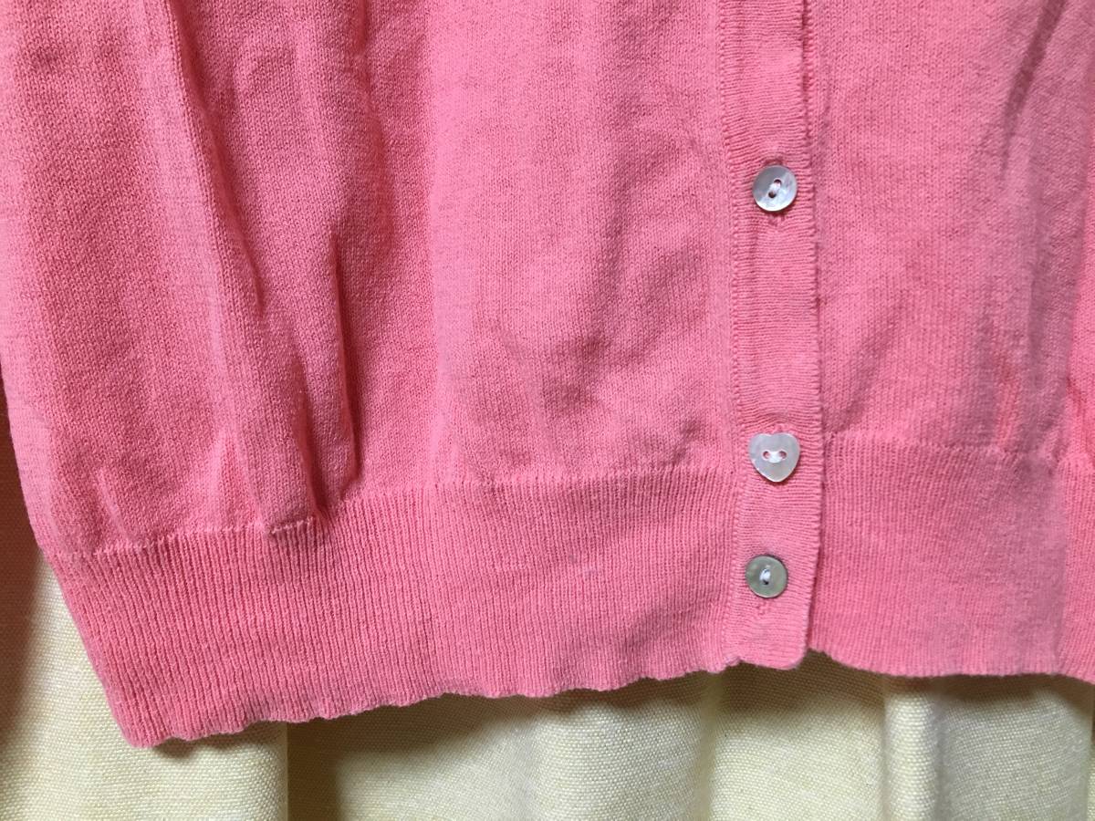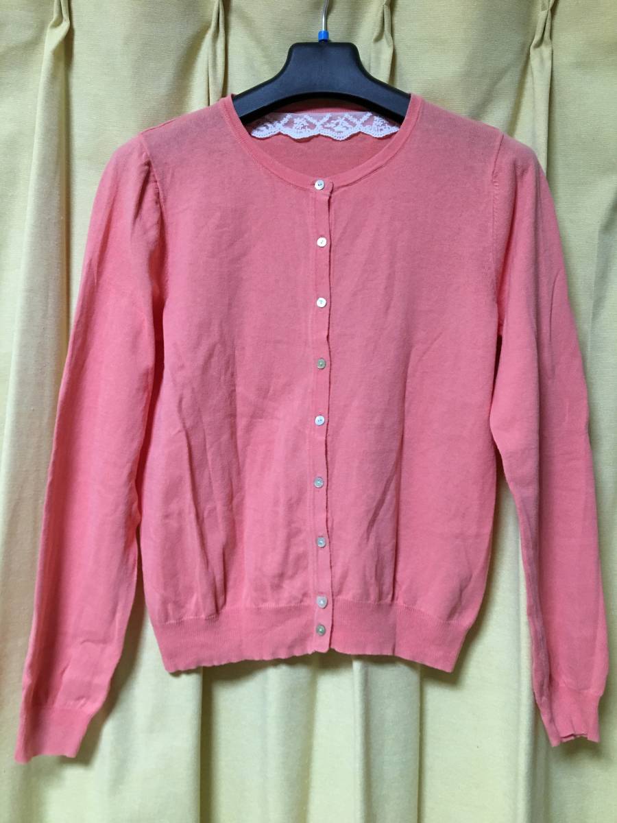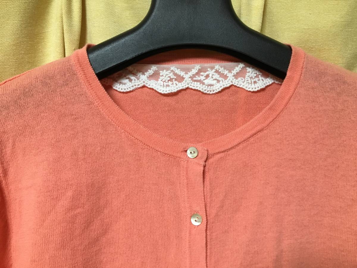 襟ぐり内側に白のレースが付いているエレガントなサーモンピンクのカーディです。