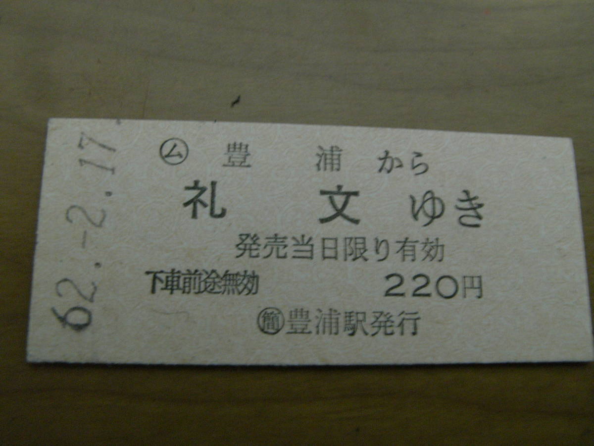 室蘭本線 ム豊浦から礼文ゆき 220円 昭和62年2月17日 簡 豊浦駅発行