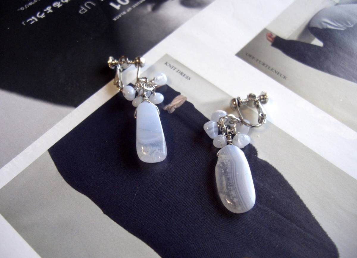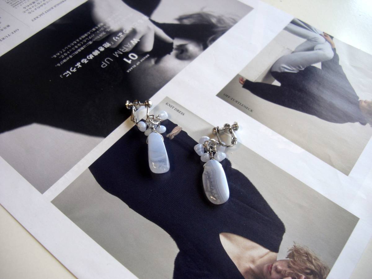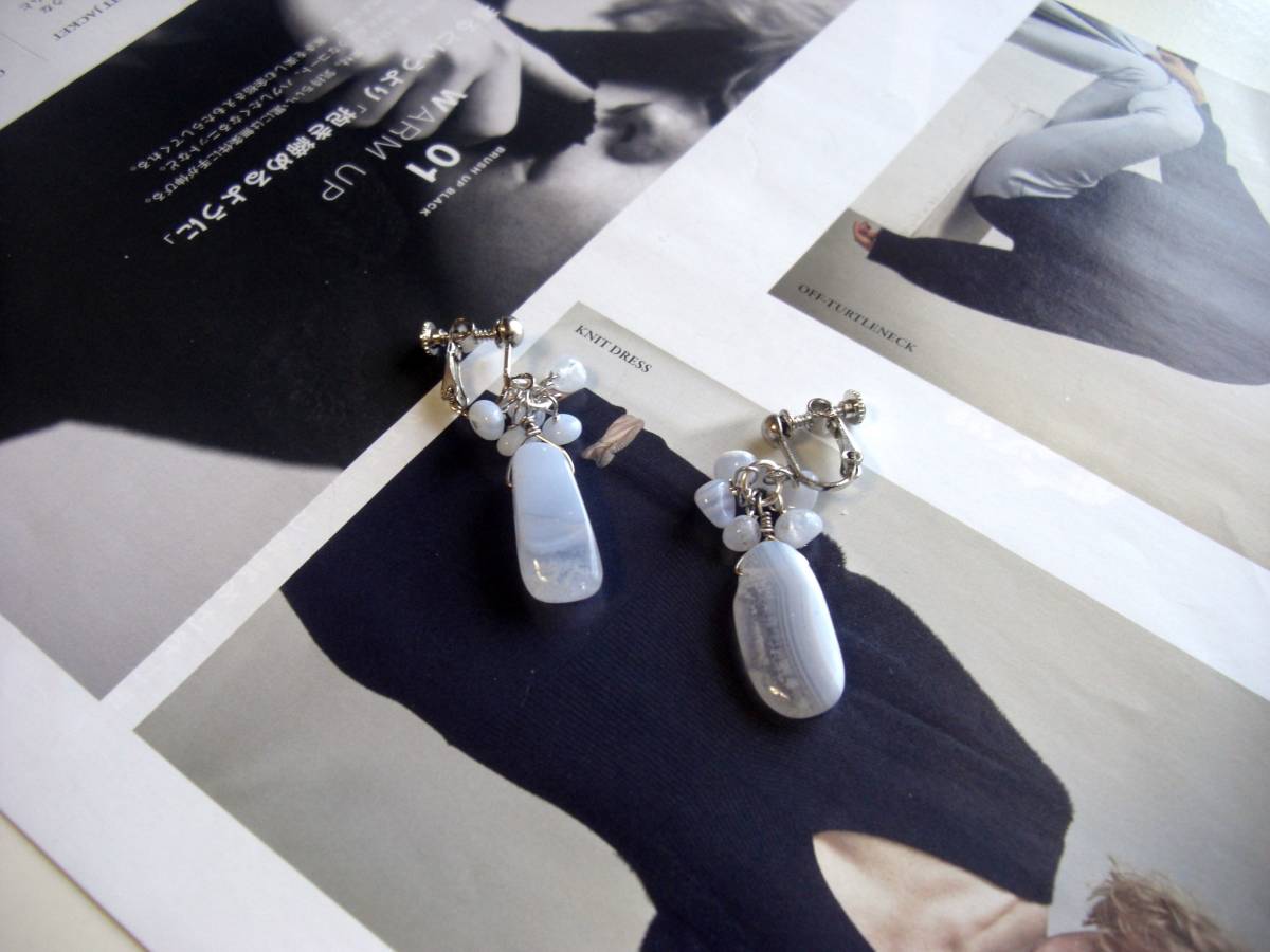 ニューヨーク・テイスト・・シリーズです♪可憐な水色・・繊細なブルーレースのイヤリングです♪儚げな水色のブルーレースを繋いでロマ ンチックな表情です♪ブルーレースは5ミリから25ミリ位のラフタンブルです♪長さは全長45ミリ位です♪ピアスに変更出来ます♪ お揃いのネックレスやブレスレットも出品しています♪ シンプルで飽きのこないいつまでも着けられるデザインを考えて作りました!ハンドメイドをご理解頂いてノークレーム、ノーリターンでお願いします