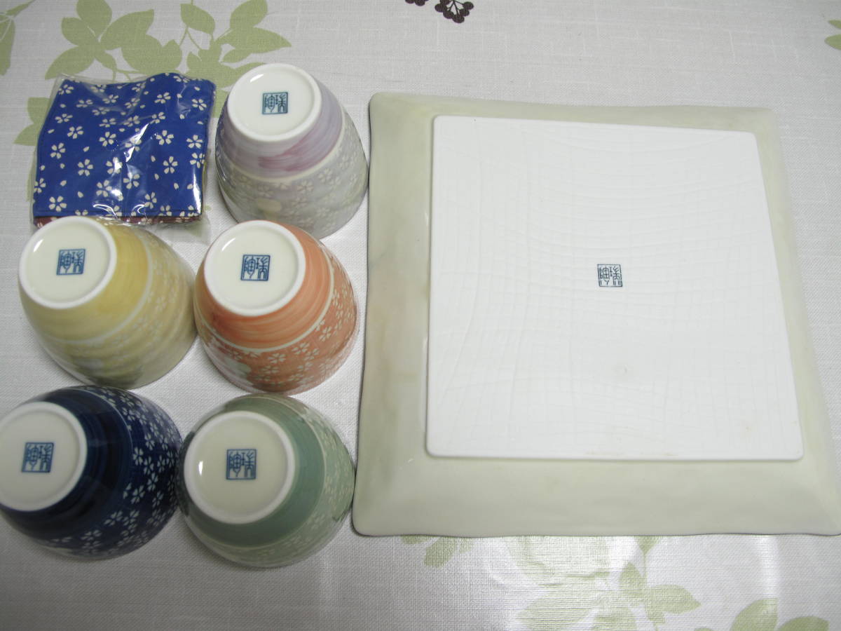 正方形の盛皿、カップ5個、コースター5枚のセットです。