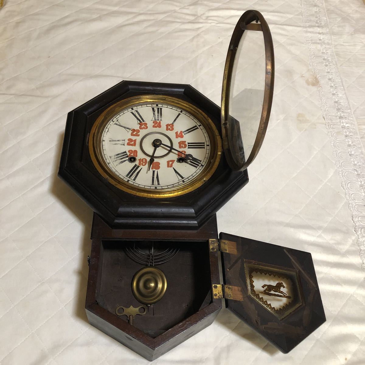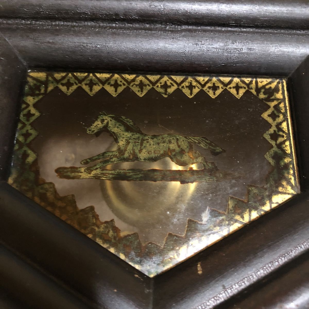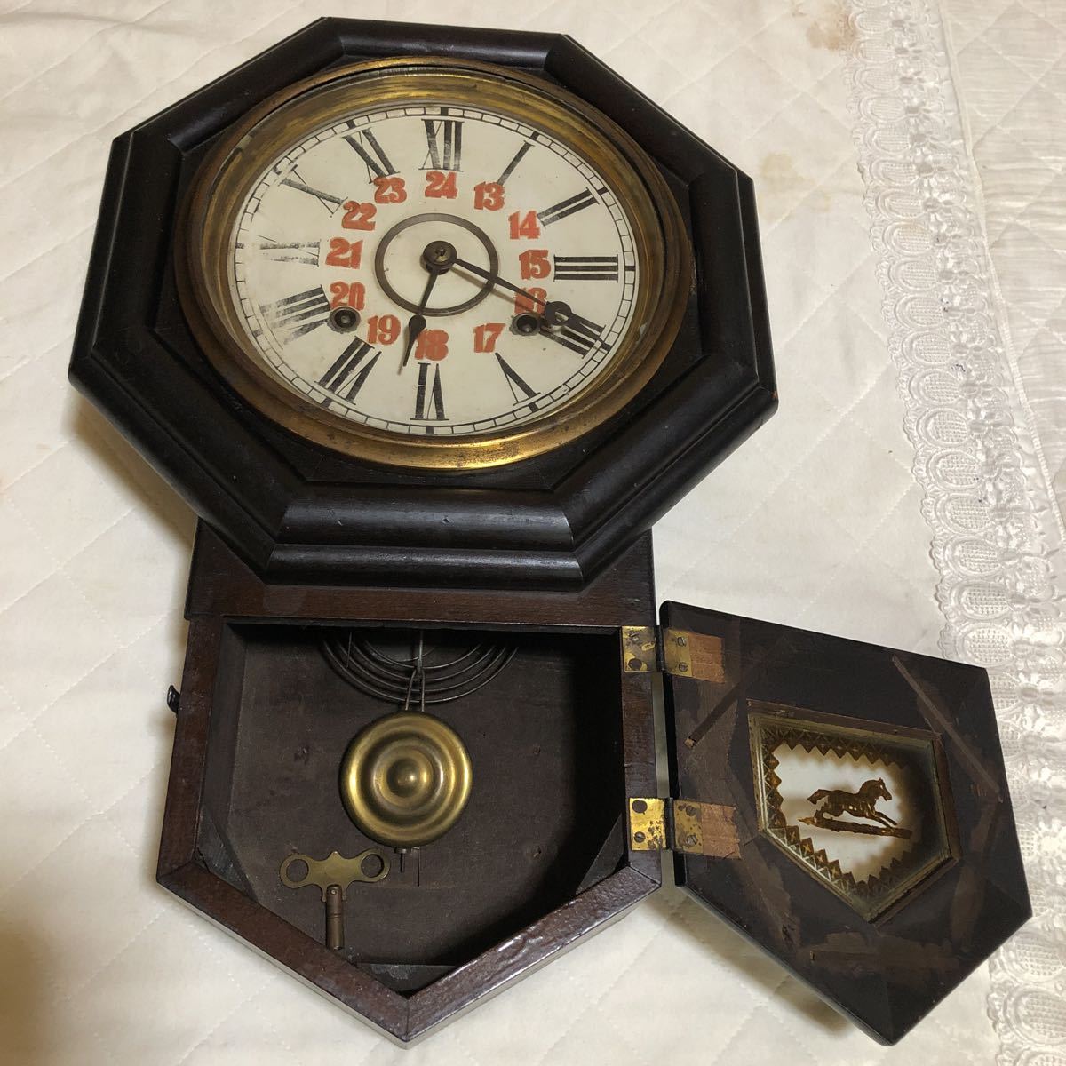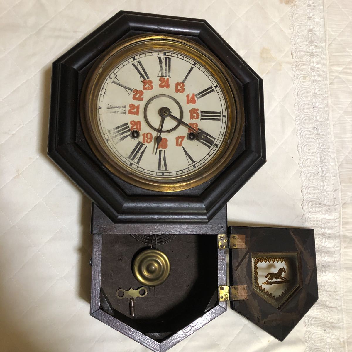 私の土佐の高知の田舎.庄屋屋敷の蔵に有った外国製の古い八角の柱時計.振り子時計です.可動します.振り子入れに馬のガラス絵が入っています.上の八角の横幅30.6センチ.下の振り子入れの横幅19センチ.時計全体の高さ47.5センチ.時計全体の厚さ約12.5センチです。宜しくお願いも申し上げます。