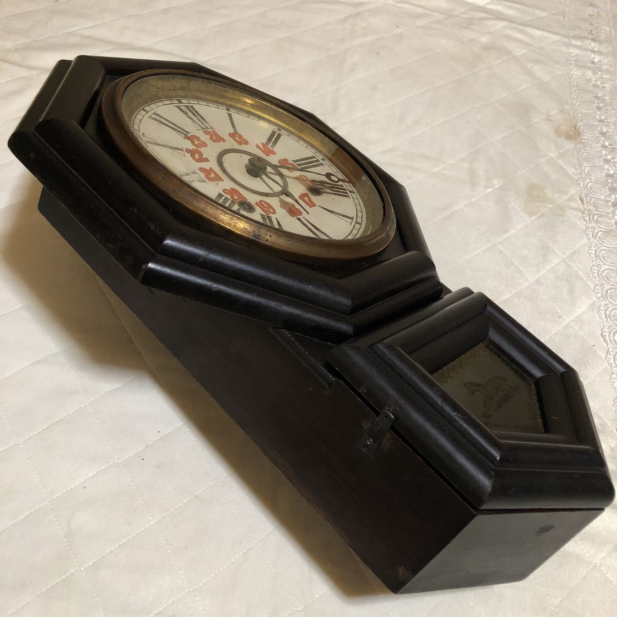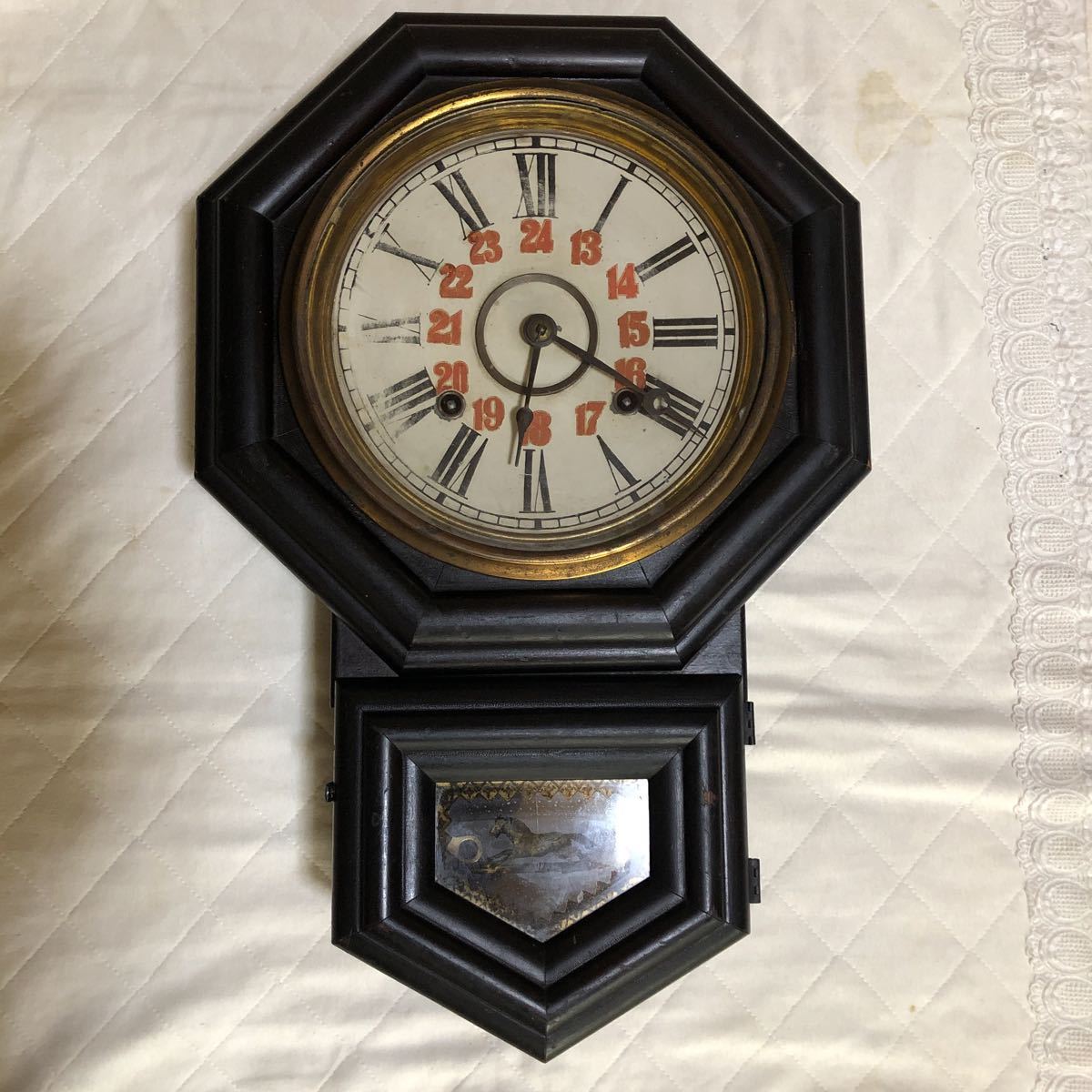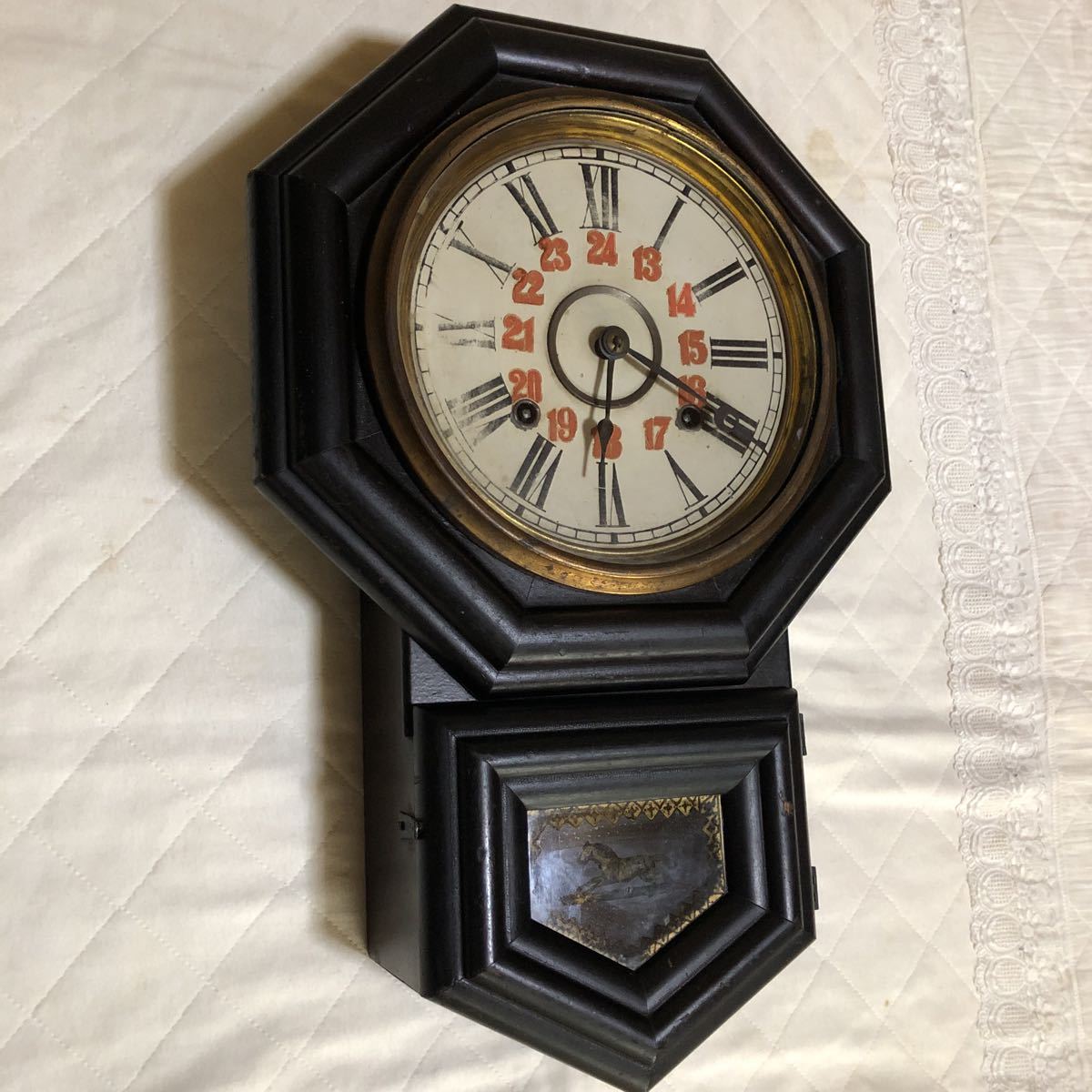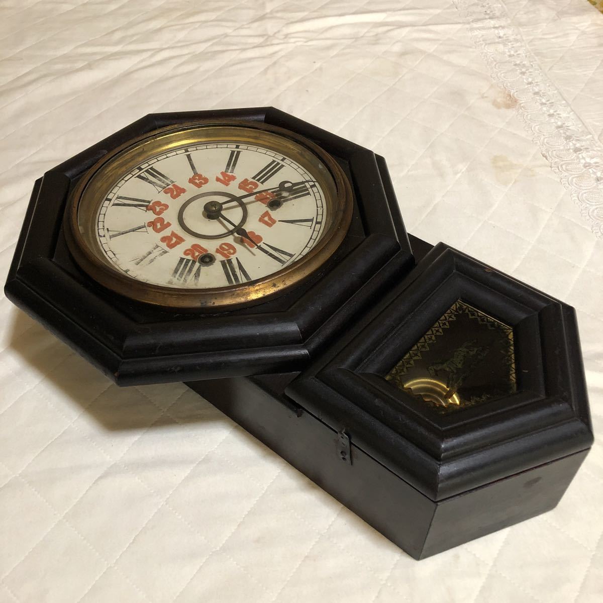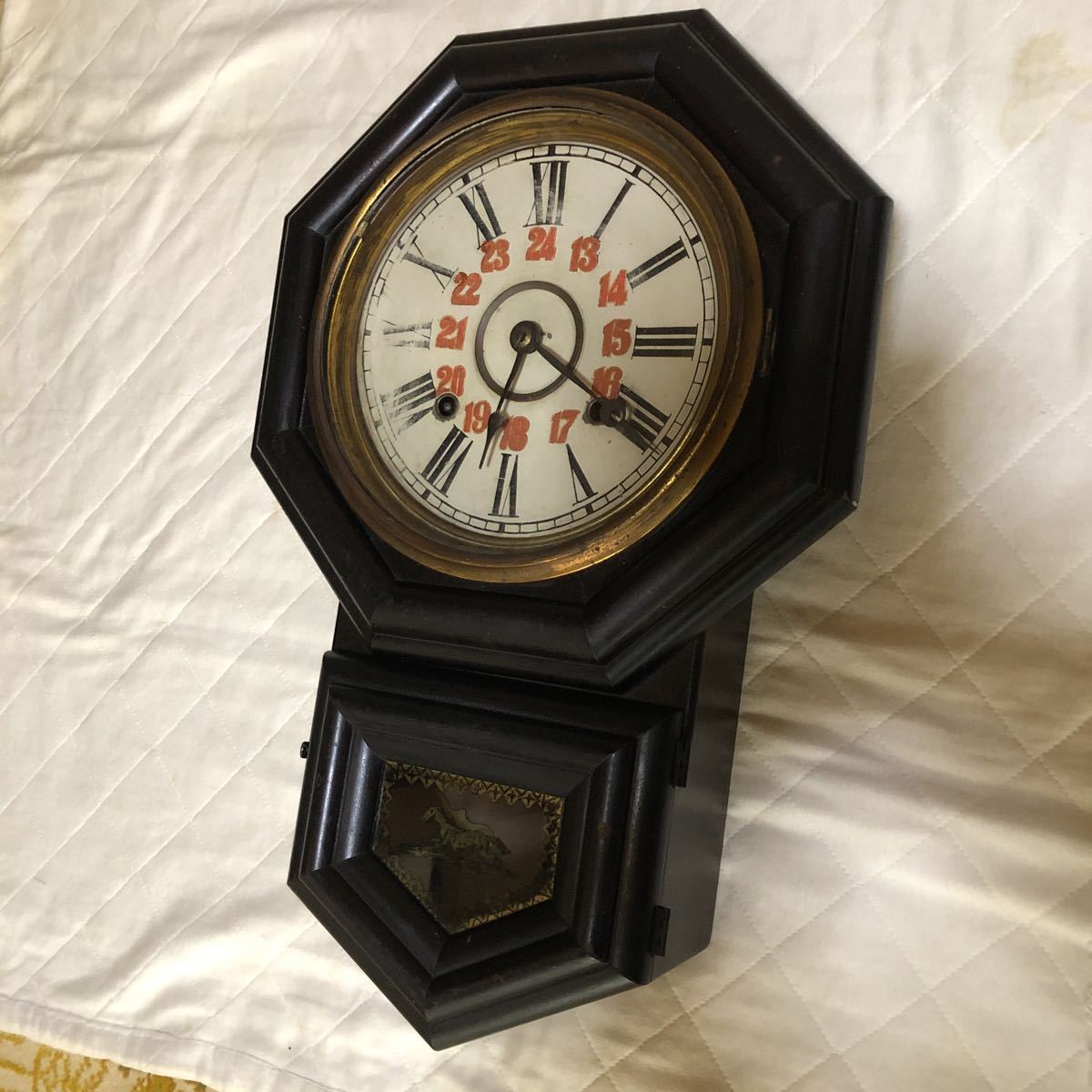私の土佐の高知の田舎.庄屋屋敷の蔵に有った外国製の古い八角の柱時計.振り子時計です.可動します.振り子入れに馬のガラス絵が入っています.上の八角の横幅30.6センチ.下の振り子入れの横幅19センチ.時計全体の高さ47.5センチ.時計全体の厚さ約12.5センチです。宜しくお願いも申し上げます。