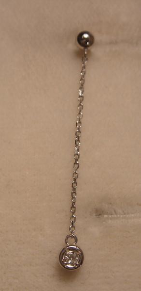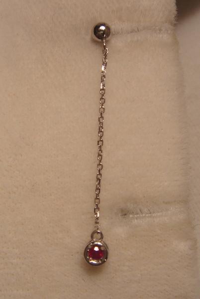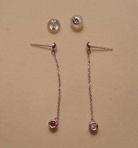 長く揺れるチェーンの先に裏表2色のルビーとダイヤが留まっていて、チェーンが揺れるたびにルビーの赤とダイヤの白(透明)がチラチラ見え隠れします。