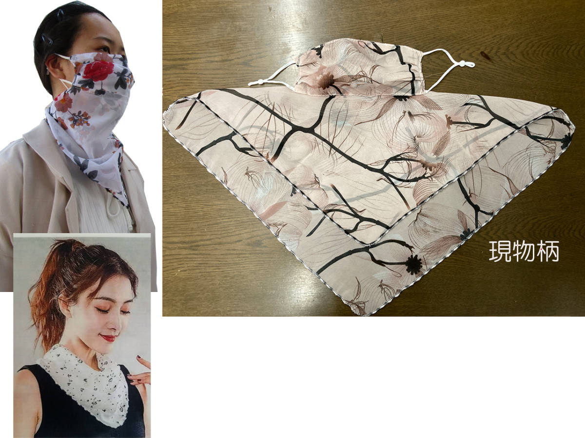 SALE!お買い得!! UVカット レディースおしゃれなスカーフマスク 紫外線対策 飛沫防止 ベージュ 大花 AMS126 これからの季節におしゃれなスカーフマスク! おしゃれ感のあるマスクにもなるスカーフです。 ファッション性も高く、風通しも良い素材なので涼しいです。 マスク部分を内側に折り込んで普通のスカーフにもなります。 日除けにも効果的なのでこれからの季節に重宝します。 *写真のモデルさんはすべて柄の共通写真なので実際は現物柄となります。