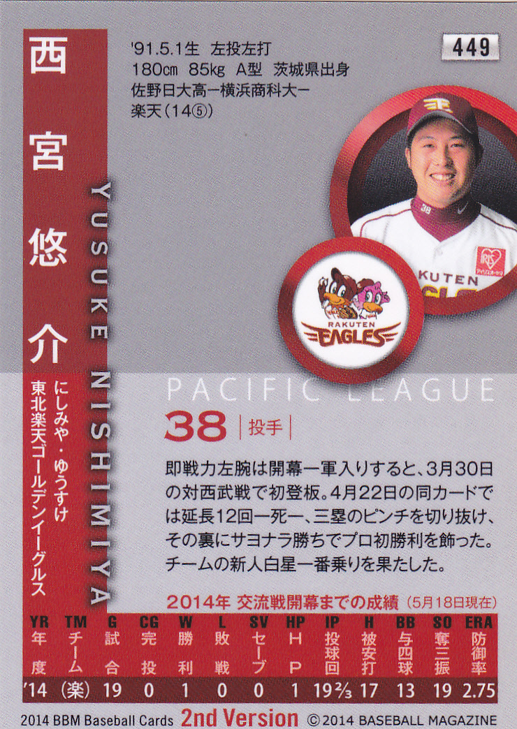 BBM2014ベースボールカード2nd 449 西宮悠介 茨城県 佐野日大高校 横浜商科大 東北楽天ゴールデンイーグルス