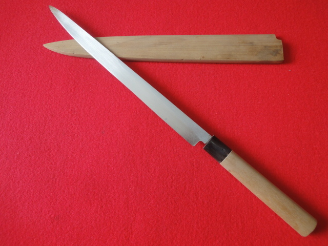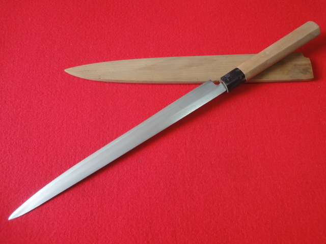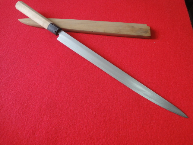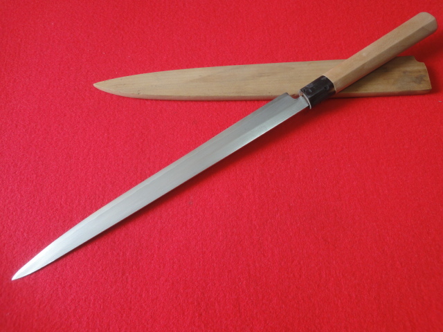 【在銘消え】河豚引き包丁 ※刺身 刃渡29.5㎝ 全長44.7㎝ 峰厚3.2㎜ ※鞘付 ※片刃 中古品 全国一律送料1100円