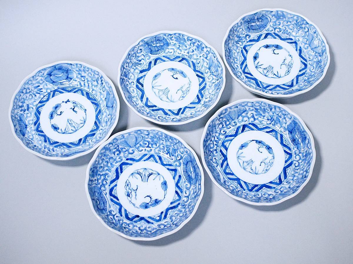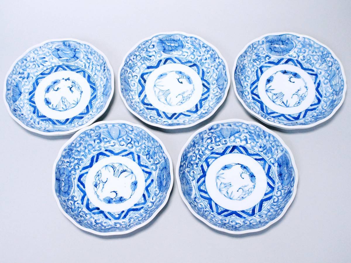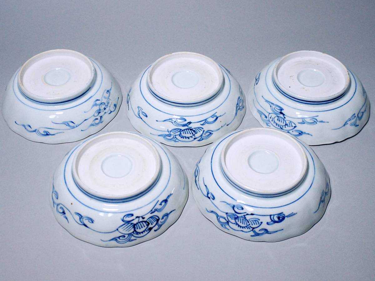 古伊万里 線書 花の図 輪花 膾皿 五枚 No.A1-890