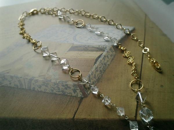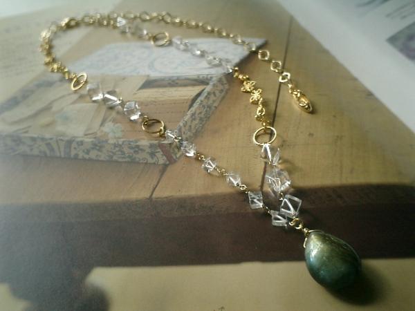 時々少女(??)になりたくて!水晶とラブラドライトのネックレスを作りました♪アンティークな雰囲気で作りました♪アガタのお好きな方にも♪水晶は4ミリと6ミリの斜めキューブです♪トップのラブラドライトは23×16ミリ位のドロップです♪角度によって色々なお色が浮かんできて神秘的です♪落ち着いたゴールドのデザインチェーンを合わせてキュートにまとめました♪♪シンプルで飽きのこないいつまでも着けられるデザインを考えて作りました!長さは全長60センチで調節自由です♪チョーカー風に着けられても可愛いです♪ハンドメイドをご理解頂いてノークレーム、ノーリターンでお願いします