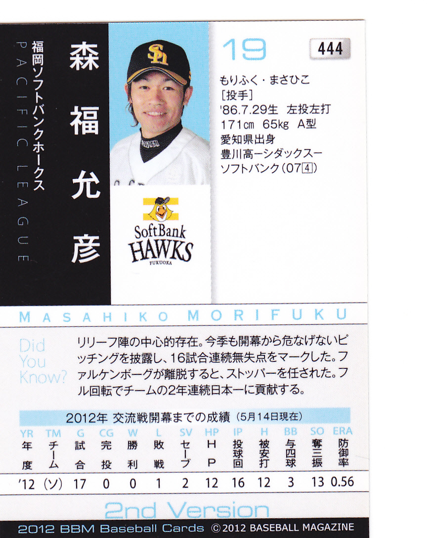BBMベースボールカード 2012-2nd 444 森福允彦 福岡ソフトバンクホークス 愛知県 豊川高校 シダックス
