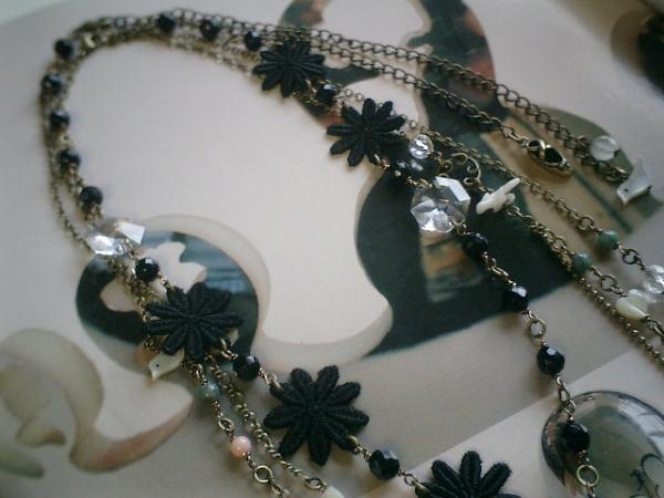パリの小鳥さんシリーズです♪ターコイズと珊瑚とシェルの小鳥さんのネックレスです♪パリ(??)っぽいアンティークな雰囲気で作りました。綿レースのネックレスとの2本セットです♪シェルの小鳥さんは15×6ミリ位です♪ターコイズとピンク珊瑚は4ミリの丸玉です♪ムーンストーンや水晶や珊瑚のさざれを合わせてさりげなくロマンチックしています♪華奢な3連のチェーンを合わせました♪長さは57センチ+アジャスター17センチで最長74センチ位です♪チョーカー風に2連にしたりブレスにしても可愛いです♪綿レースのネックレスは6ミリのオニキスに22ミリ位の黒の綿レースとスワロのトップを合わせました♪長さは全長61センチ位で調節自由です♪トップのスワロは10×14ミリ位です♪シンプルで飽きのこないいつまでも着けられるデザインを考えて作りました!どちらのネックレスも単品でも出品しています♪お揃いのブレスレット、ピアスも出品しています♪ハンドメイドをご理解頂いてノークレーム、ノーリターンでお願いします