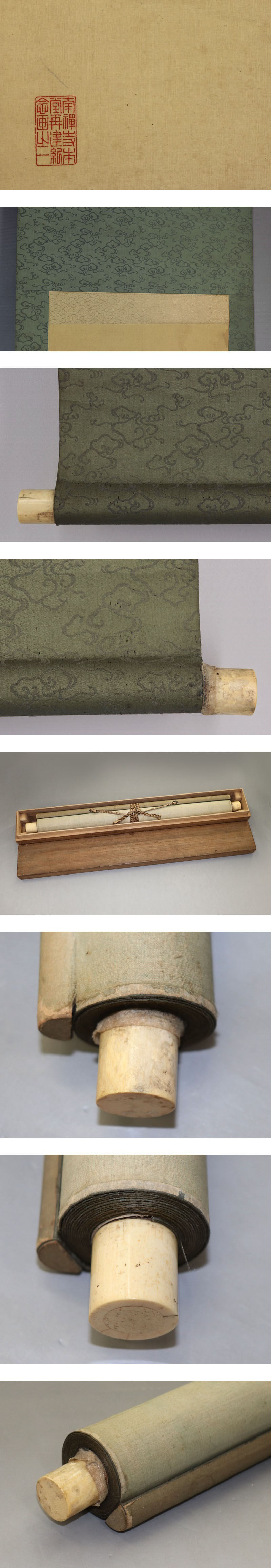 上田萬秋 うえだ ばんしゅう 1869-1952 明治-昭和時代の日本画家。 明治2年8月15日生まれ。今尾景年に師事。明治36年の内国勧業博覧会などに出品したのち、 文展で第1回展から活躍。花鳥画を得意とした。大正8年日本自由画壇結成に参加。 昭和27年12月15日死去。83歳。 京都出身。京都府画学校卒。本名は巳之太郎。号は「まんしゅう」ともよむ。 本紙は、染み、汚れ、折れ、皺、ヤケがあります。 表装は、染み、汚れ、折れ、皺、破れ、ほつれ、くすみ、修復痕、 軸先に汚れと傷みがあり、左右違います。 【サイズ】 作品 横約35.5cm×縦約104cm 表装 横約47cm×縦約186cm |