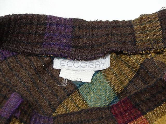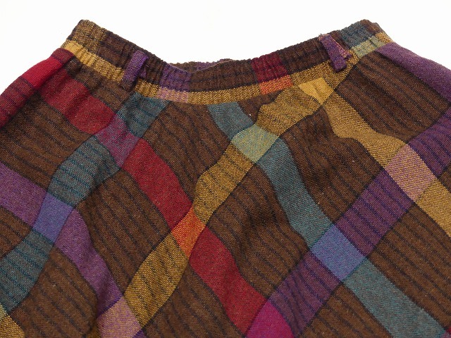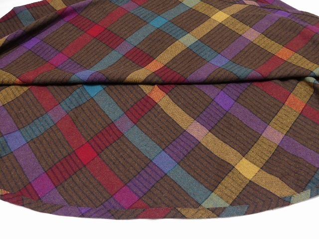 | こちらは、80年代頃のECCOBAYのチェック スカートです。 バイアス地に裁断されていますので、裾の広がりやシルエットが綺麗で、ウエストがゴムデザインは着心地抜群です。また、ベルトループがありますのでトップスをタックインにしてお好きなベルトで合わせて頂くのも可愛いかと思います。チェックの配色も、個性的でチェック自体のテキスタイルも珍しいですが、ブラウンベースのお色とシンプルなフレアデザインですので、長く愛用頂けそうです。 コンディションは多少の使用感がありますが、大きく目立つダメージはございません。 素材 ウール×アクリル×ポリエステル サイズ S (着用感M-Lサイズ位です) ウエスト60-86cm(ゴムになっています) 総丈75cm 撮影用BODYサイズ 肩幅37cm バスト82cm ウエスト60cm ヒップ86cm 素人採寸の為、多少の誤差はご了承ください。 | |||