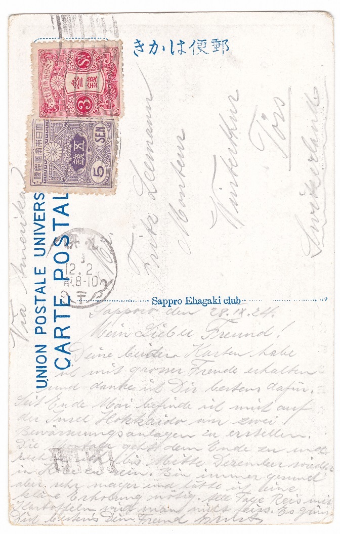 田沢旧大正毛紙3銭、5銭貼外信はがき 機械印 札幌/(13).12.2/前8-10