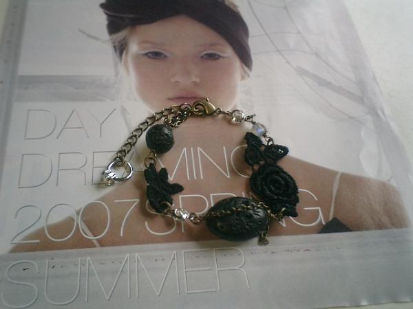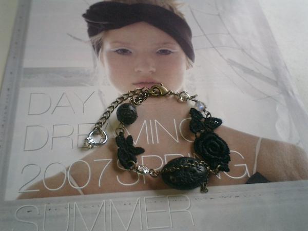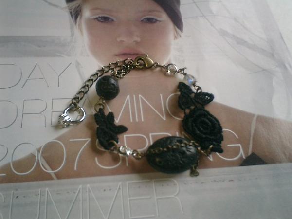 夜のパリシリーズです!アンニュイな大人のシリーズです♪ナチュラルなラバーストーンと繊細な綿レースのブレスレットです♪自然の雰囲気を残したやさしい黒のラバーストーンと綿レースがシックにまとまりました♪ラバーストーンは10ミリの丸玉とチェーンでおめかしした15×20ミリのオーバルです。綿レースは薔薇の模様です♪間にラブラドライトやジルコニアを合わせてさりげなくロマンチックしています♪長さは全長22センチ位で調節自由です♪♪シンプルで飽きのこないいつまでも着けられるデザインを考えて作りました!お揃いのネックレスも出品しています♪ハンドメイドをご理解頂いてノークレーム、ノーリターンでお願いします