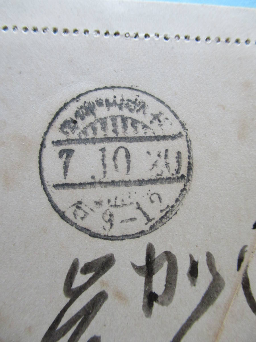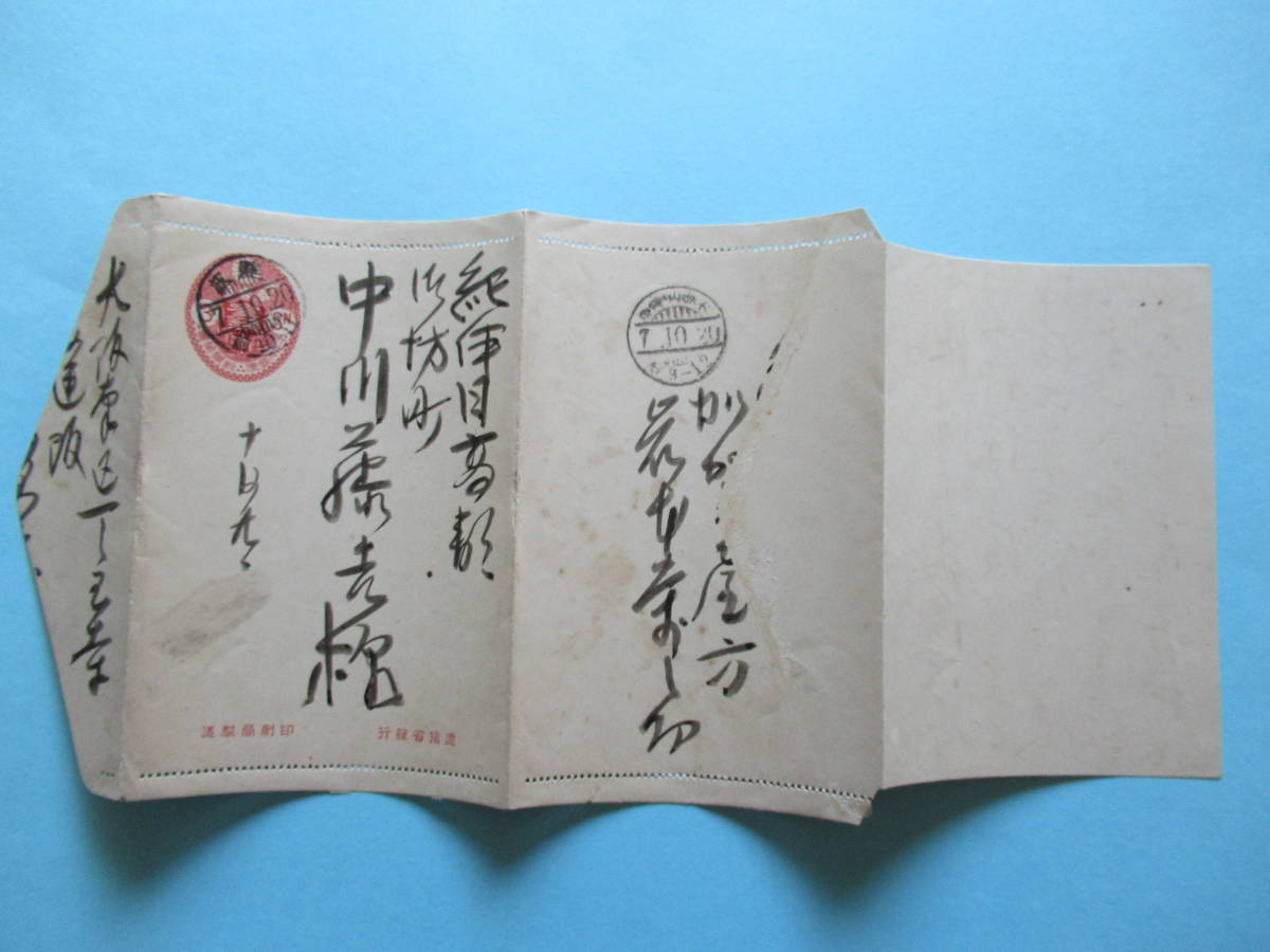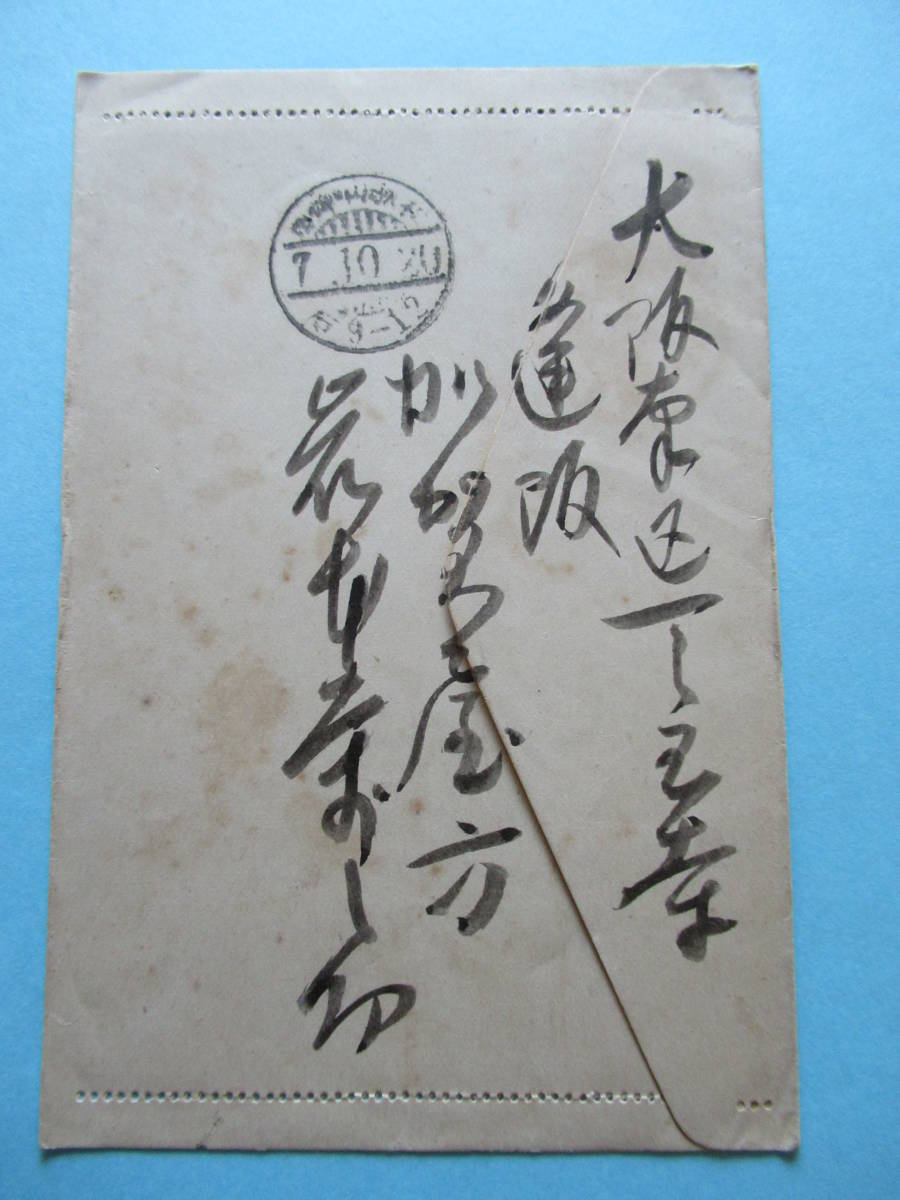 《フラップ完全》 小判型封緘はがき 3銭 【3穴】 櫛 難波 7.10.20 → 和歌山・御坊  ※大阪