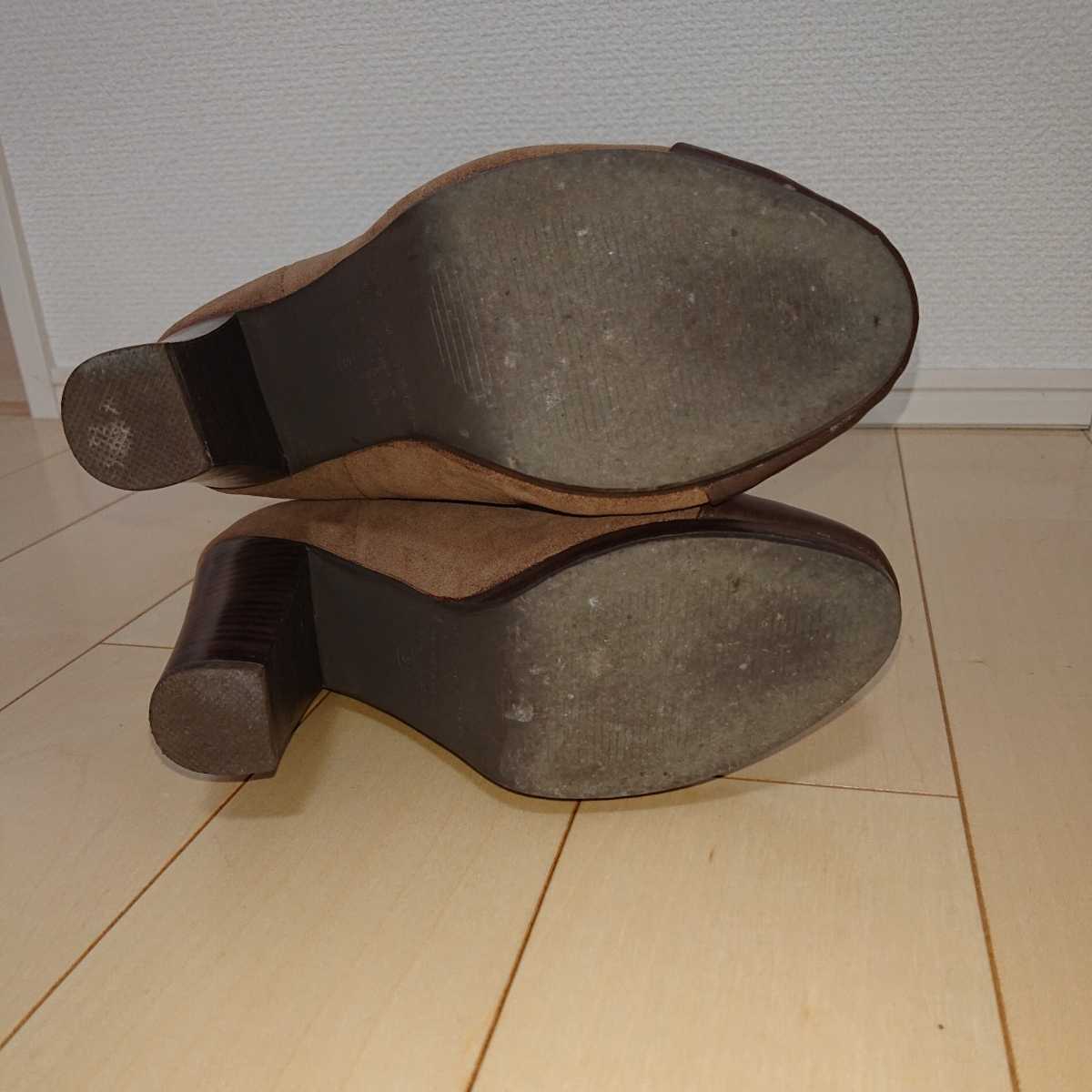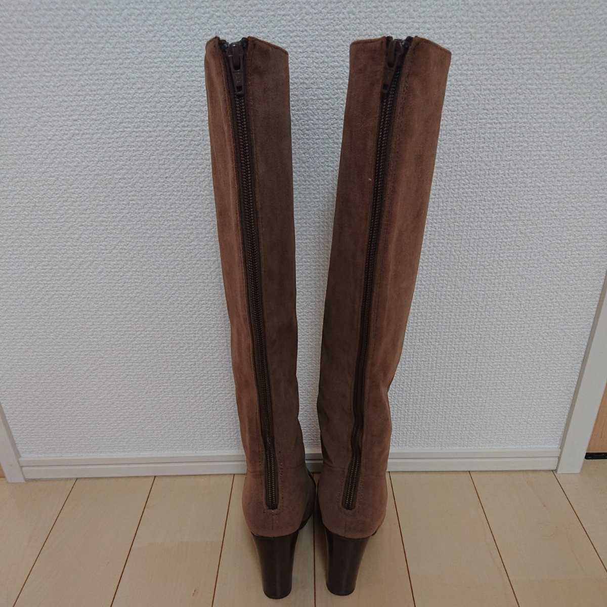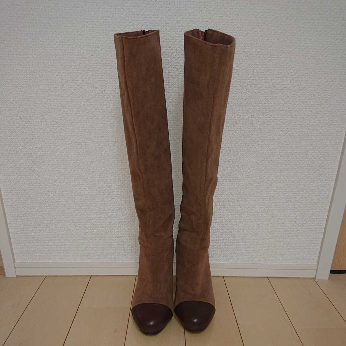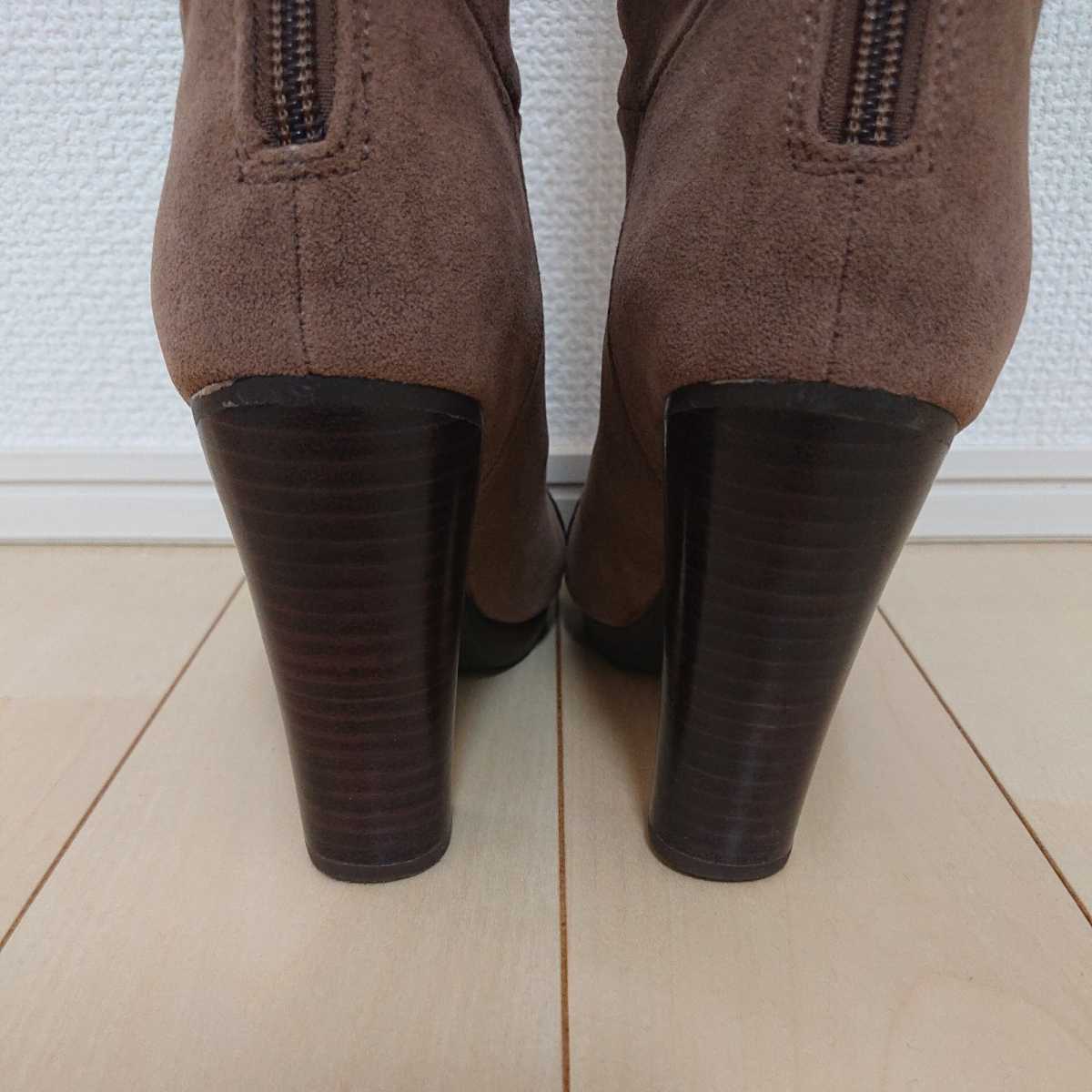 スエード素材でつま先がレザー加工になっているロングブーツです。ヒールが10cmですが、前が1cm厚みがあり、ヒールも太めなので歩きやすいかと思います。