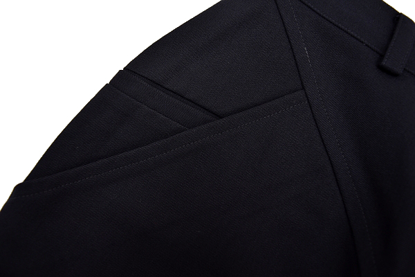 フロントジッパーの下部分の縫い合わせを基準に、ウエストと平行にして端と端を測っています。片側採寸ですので、数字を2倍していただけますと、尻回りの数字になります