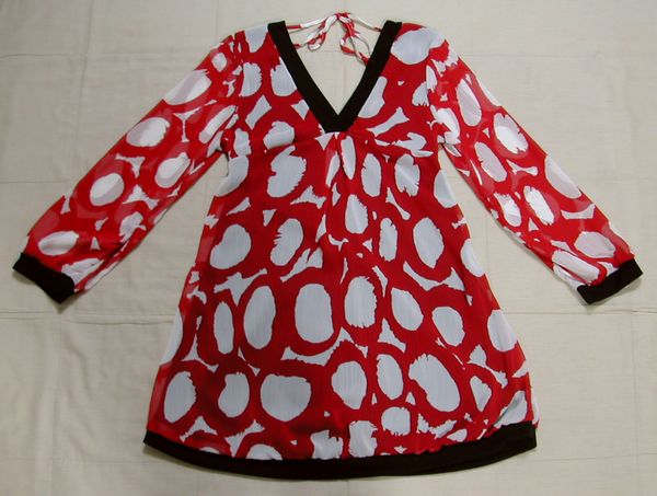 ■美品:赤白柄薄手チュニック 赤地に白い水玉(?)M位 DmK91
