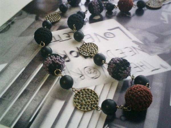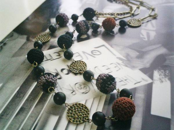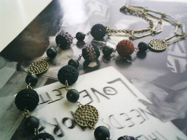イノセント・ガール・・シリーズです♪モノトーンを集めて・・黒・ダークパープル・ブラウンの大人色のシックなネックレスです♪やさしい黒のマットオニキスは10ミリの丸玉です♪黒やブラウンやダークパープルの15ミリの編みボールやデザインメタル、デザインチェーンを合わせてキュートな表情です♪長さは全長96センチ位で調節自由です♪2連にされても素敵です♪♪お揃いのブレスレットや同じシリーズも出品しています♪シンプルで長く着けていただけるデザインを考えて作りました♪ハンドメイドをご理解頂いてノークレーム、ノーリターンでお願いします