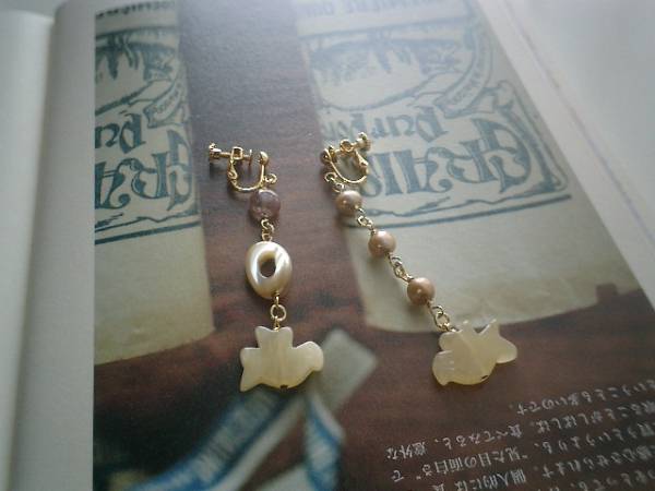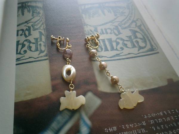 アートモダン・コレクション・・シリーズです♪小鳥さんと・・やさしいイエローベージュ色でまとめたシックなイヤリングです♪デザイン違いの2本です♪遊びの入ったデザインです♪13×17ミリ位のアラゴナイトの小鳥さんにシャンパンベージュ色の淡水パールやシェルリングやルチルクォーツのコインを合わせて大人のロマンチックしています♪長さはどちらも7.3センチ位です♪それぞれペアでもお作り出来ます♪ピアスにも変更出来ます♪お揃いのネックレスやブレスレットも出品しています♪シンプルで飽きのこないいつまでも着けられるデザインを考えて作りました!ハンドメイドをご理解頂いてノークレーム、ノーリターンでお願いします