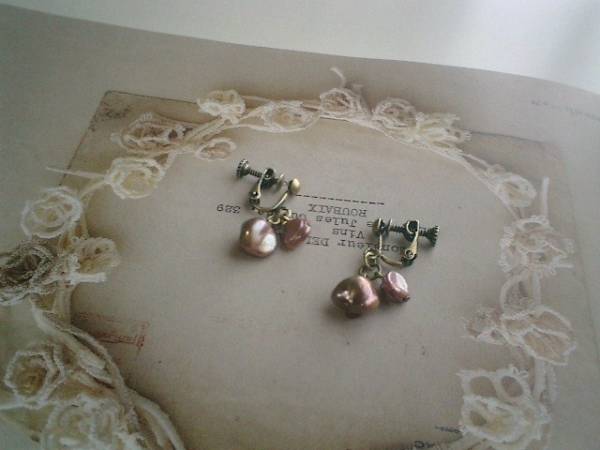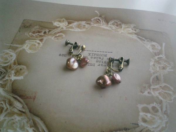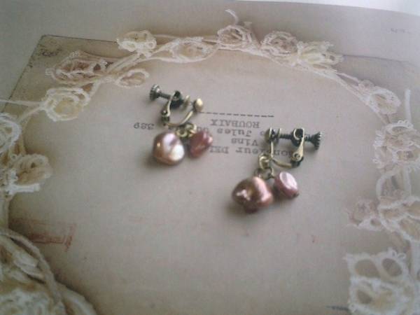 ジャンヌの手仕事・・シリーズです♪センチメンタル少女・・シックな芥子パールのイヤリングです♪ペア1組です♪9ミリから11ミリ位までのブロンズピンクの芥子パールを合わせました♪さりげなく華やかな表情です♪長さは3センチ位です♪ピアスにも変更出来ます♪お揃いのネックレスやブレスレットも出品しています♪♪シンプルで飽きのこないいつまでも着けられるデザインを考えて作りました!ハンドメイドをご理解頂いてノークレーム、ノーリターンでお願いします