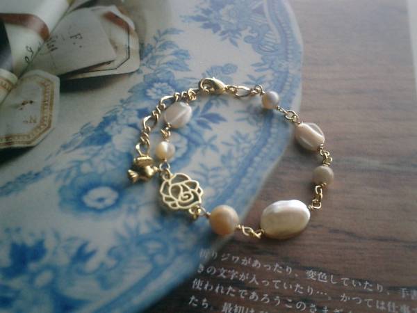 ロマンチック見本帳・・シリーズです♪物憂げな色を集めて・シックなマザーオブパールのブレスレットです♪薔薇を合わせて大人のロマンチックしています♪マザーオブパールは6ミリ、8ミリの丸玉に10×8ミリ、14×10ミリのフラットオーバルです♪繊細なマットゴールドの薔薇の透かしチャームを合わせてさりげなく華やかです♪長さは全長22センチ位で調節自由です♪♪お揃いのブレスレットやネックレスやピアスも出品しています♪シンプルで飽きのこないいつまでも着けられるデザインを考えて作りました!ハンドメイドをご理解頂いてノークレーム、ノーリターンでお願いします