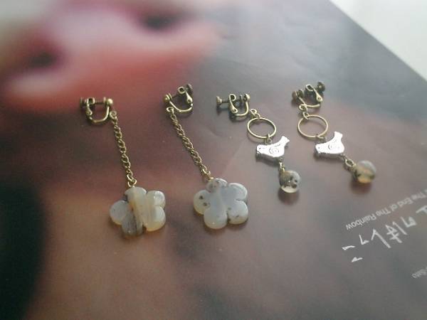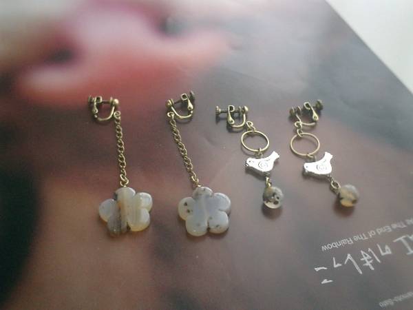 私的・乙女心・・シリーズです♪秋のクローゼット・・シックなモノトーンのイヤリング4本セットです♪ペア2組です♪ニュアンスのある石を集めて大人のロマンチックしています♪モスアゲートのお花は20ミリ位、ボツワナアゲートは8ミリの丸玉に小鳥さんのチャームを合わせました♪♪長さは小鳥さんのセットが6センチ、モスアゲートのお花のイヤリングが7・5センチ位です♪ピアスにも変更出来ます♪お揃いのネックレスやブレスレットも出品しています♪♪シンプルでいつまでも着けられるデザインを考えて作りました!ハンドメイドをご理解頂いてノークレーム、ノーリターンでお願いします