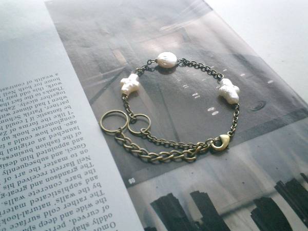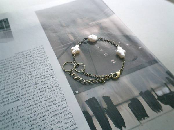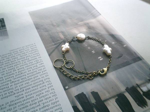 仏蘭西映画の恋人・・シリーズです♪カフェオレ気分で・・シックな淡水パールのブレスレットです♪デザイン違いの淡水パールをスタイリッシュにまとめました♪オフホワイトの淡水パールは10ミリのコインと14ミリのクロスです♪デザインリングを合わせてキュートな表情です♪長さは16センチ+アジャスター7センチで全長23センチ位です♪お揃いのネックレスも出品しています♪シンプルで長く着けていただけるデザインを考えて作りました♪♪ハンドメイドをご理解頂いてノークレーム、ノーリターンでお願いします