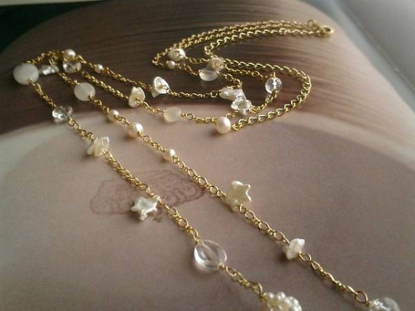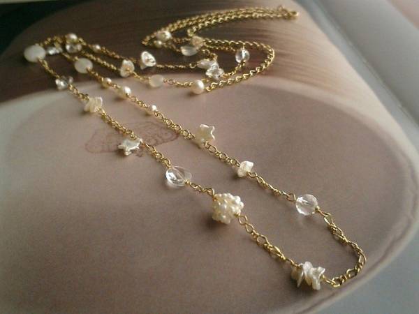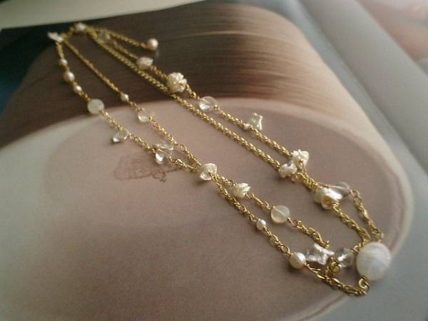 ジゼルの季節・・シリーズです♪繊細な芥子パールのネックレスです♪6ミリから10ミリ位までの大きさ違いの芥子パールや4ミリ、6ミリのポテトの淡水パールや10ミリの淡水パール玉、6ミリのランダムカット、8ミリのハート、10×8ミリのオーバルカットなどデザイン違いの水晶や8ミリ、10ミリのコイン、15×10ミリ、10×8ミリのオーバルなどデザイン違いのムーンストーンなど可憐な石を集めてロマンチックな表情です♪長さは全長115センチ位で調節自由です♪画像のように2連にされても可愛いです♪お揃いのネックレス3本セットや2本セット、ブレスレットやピアスも出品しています♪シンプルで長く着けていただけるデザインを考えて作りました♪♪ハンドメイドをご理解頂いてノークレーム、ノーリターンでお願いします。