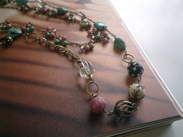 巴里の小さな宝石屋さんシリーズです♪幻想と怠惰・巴里の路地裏をイメージしたネックレス2点セットです♪儚げで繊細なイメージで作りました♪シックなお色のロードナイトとターコイズとスモーキークォーツは4ミリの丸玉です♪小さくまとめて可憐な表情のネックレスです♪長さは全長68センチ位で調節自由です♪チョーカー風にしたりブレスにしても素敵です♪こちらは単品でも出品しています♪ナチュラルなお色のターコイズは12ミリ位のタンブルです♪繊細な15ミリ位のラフカットや8ミリの丸玉のスモーキークォーツや彫りの10ミリのロードナイトや座金でおめかししたアフリカンオパールやドットのとんぼ玉など個性的な石を集めて大人のロマンチックしています♪長さは全長82センチ位で調節自由です♪2連にされても可愛いです♪お揃いのブレスレットや同じシリーズも出品しています♪シンプルで長く着けられるデザインを考えて作りました!ハンドメイドをご理解頂いてノークレーム、ノーリターンでお願いします