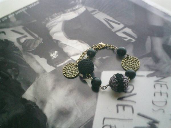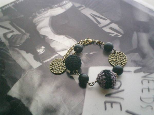 イノセント・ガール・・シリーズです♪モノトーンを集めて・・黒・ダークパープルの大人色のシックなブレスレットです♪やさしい黒のマットオニキスは10ミリの丸玉です♪黒やダークパープルの15ミリの編みボールやデザインメタル、デザインチェーンを合わせてキュートな表情です♪長さは全長24センチ位で調節自由です♪お揃いのネックレスや同じシリーズも出品しています♪シンプルで長く着けていただけるデザインを考えて作りました♪ハンドメイドをご理解頂いてノークレーム、ノーリターンでお願いします