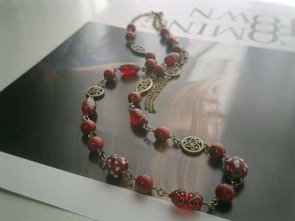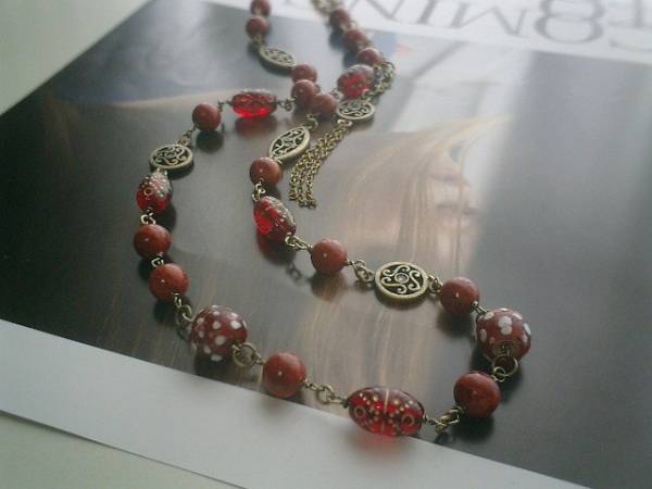 イノセント・ガール・・シリーズです♪巴里の帽子屋さん・・スポンジ珊瑚のキュートなネックレスです♪8ミリの丸玉のスポンジ珊瑚に水玉のとんぼ玉や深い赤のベネチアビーズやデザインチャームを合わせて可憐な表情です♪長さは全長73センチ位です♪2連にされてもブレスにされても素敵です♪お揃いのネックレスやブレスレットも出品しています♪シンプルで長く着けていただけるデザインを考えて作りました♪ハンドメイドをご理解頂いてノークレーム、ノーリターンでお願いします