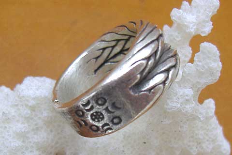 | タイ北部に住む山岳民族カレン族のシルバーリングです。 カレン族シルバーの純度は925からそれ以上と非常に高い純度です。 ハンドメイドによって作られるカレン族シルバーは、1つ1つ表情が違い、温かさを感じます。 また1つ1つ手打ちで丁寧に打たれた刻印の文様は神秘的かつ繊細な印象を与えてくれます。 ●サイズ:約17号(+2号くらいまで調整可能) ●リング幅:最大約10㎜ |