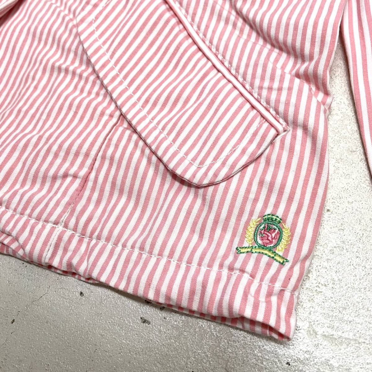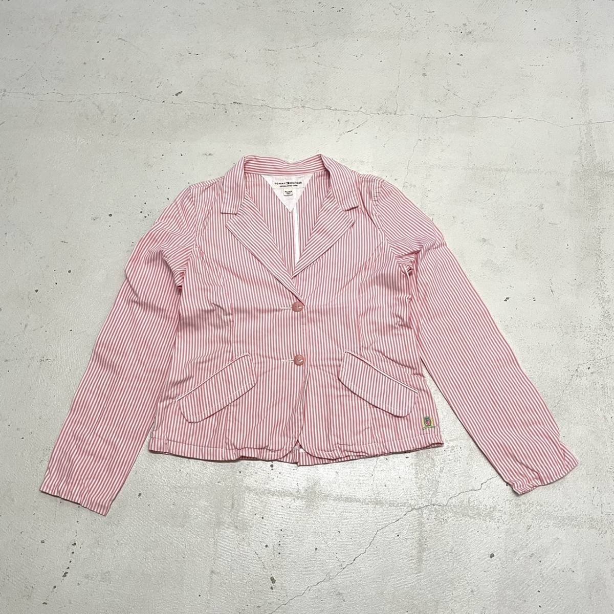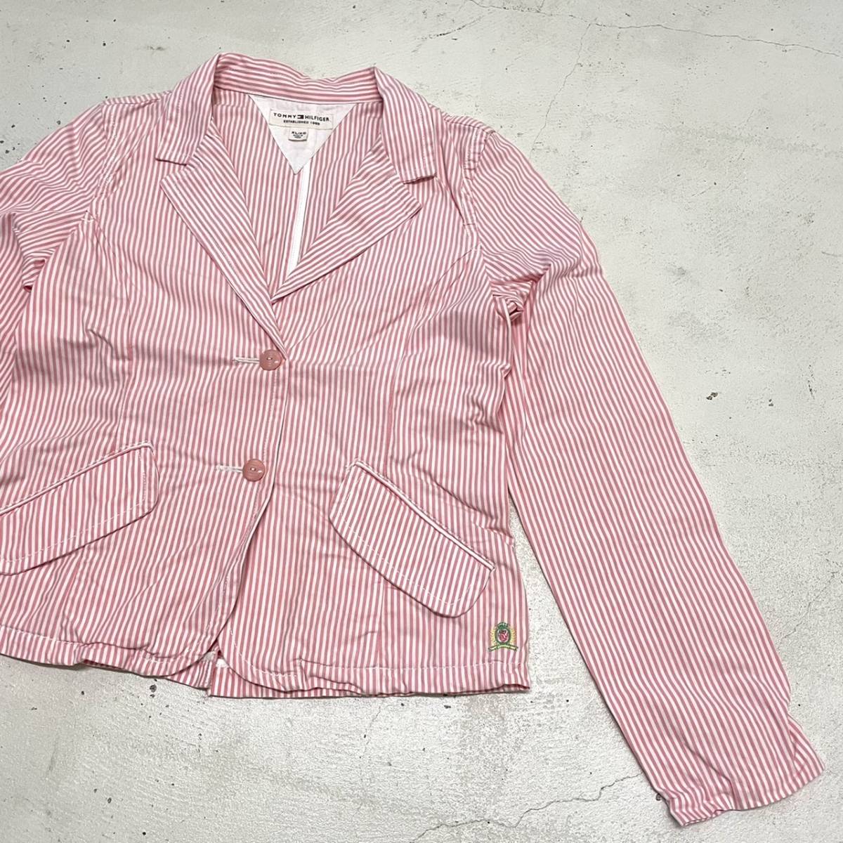 USA古着です。 トミーヒルフィガーのテーラードジャケットです。 シャツ生地、肩パットなしの軽い着心地。 ピンク×白のキャンディーストライプ柄です。 シェイプの効いた細身のシルエット、ショート丈になります。 左裾に人気のクレスト刺繍。 裏地は付いていません。 海外キッズサイズですので着用感XSサイズ程度です。 洗濯済みになります。お探しの方におすすめです。 | |||