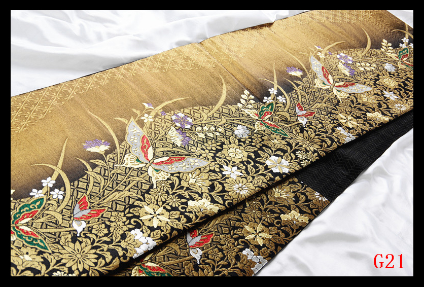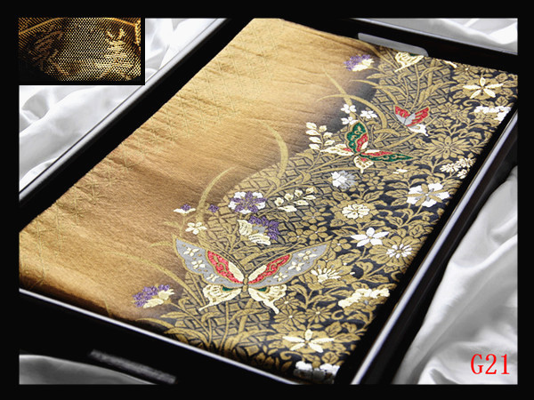 【G21】厳選西陣 手織り 裳美 お振袖にも 更紗花蝶文様 金色地 六通高級正絹純金糸美術袋帯 ◇検◇簪着物名古屋帯帯締め