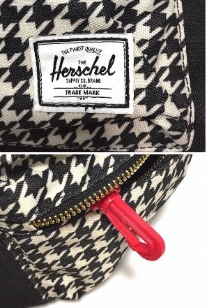 フロントポケットが千鳥格子デザインでサイドにはブランドタグが付きます。