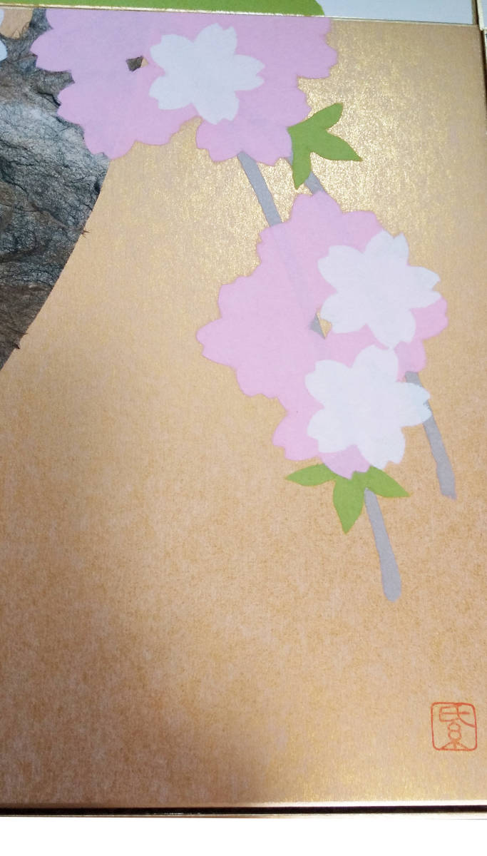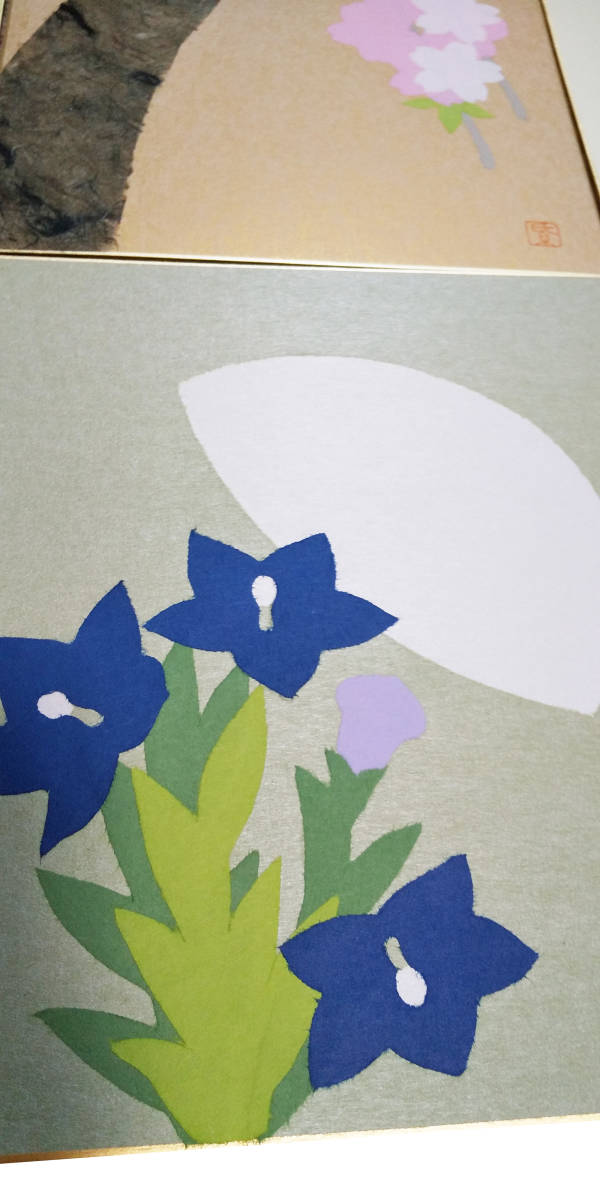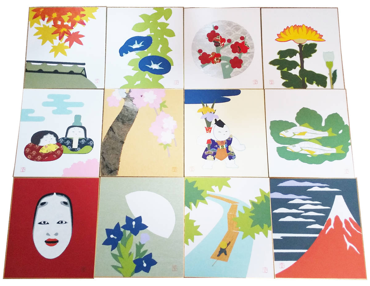 色紙に十二ヶ月の風物を和紙で貼り付けた作品です。