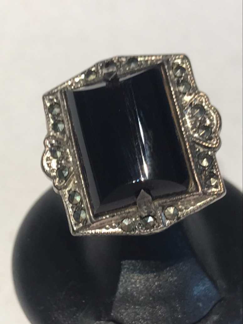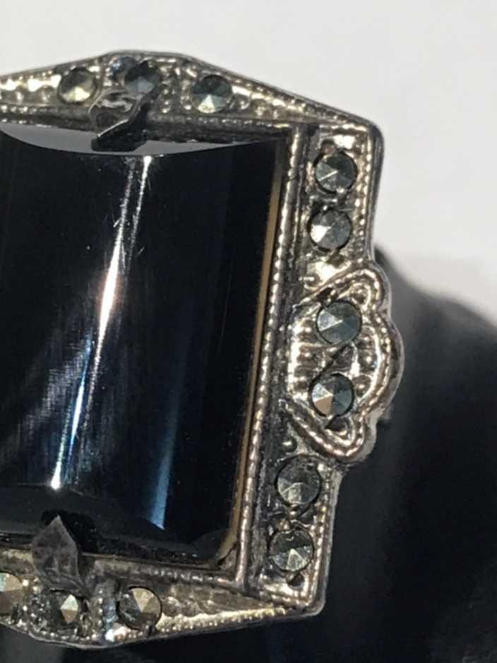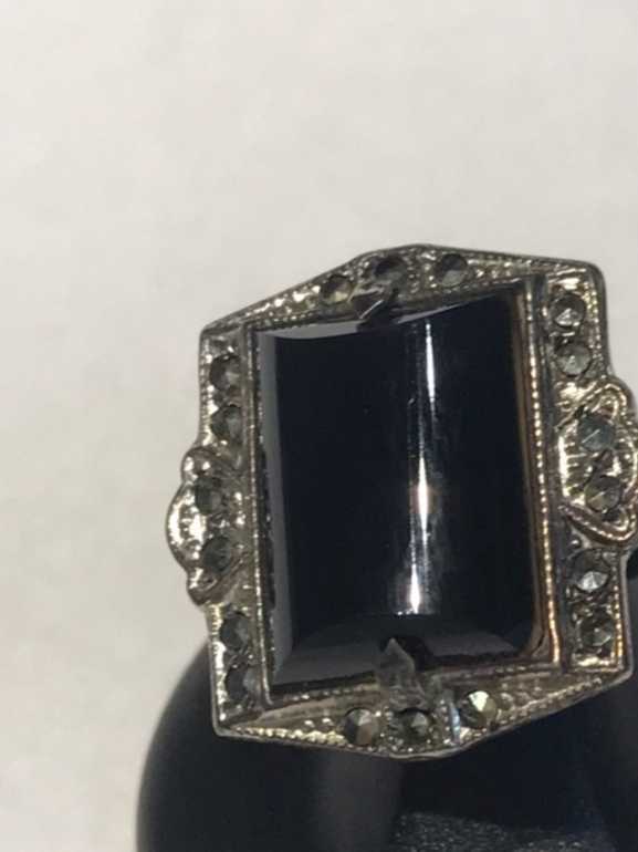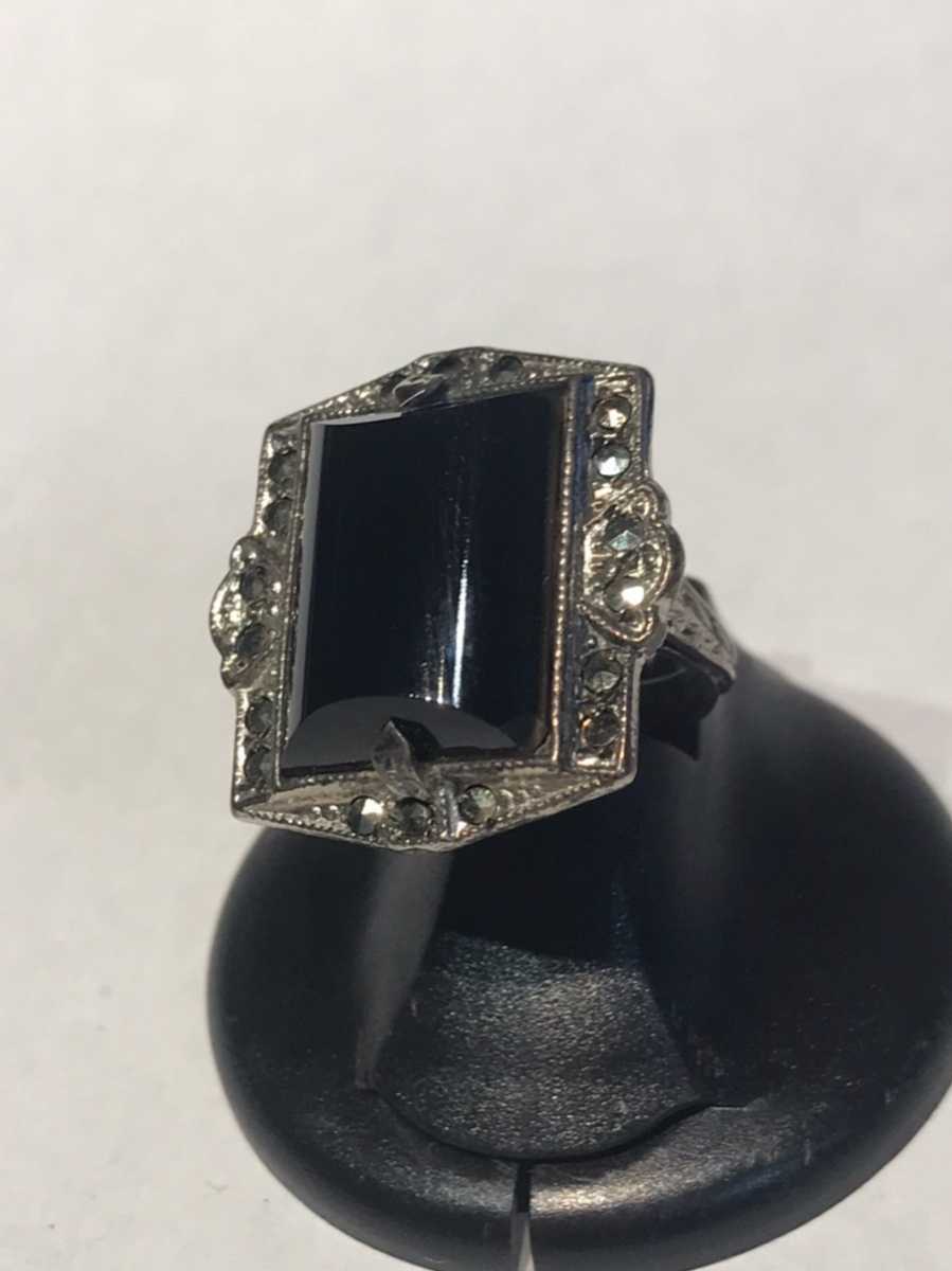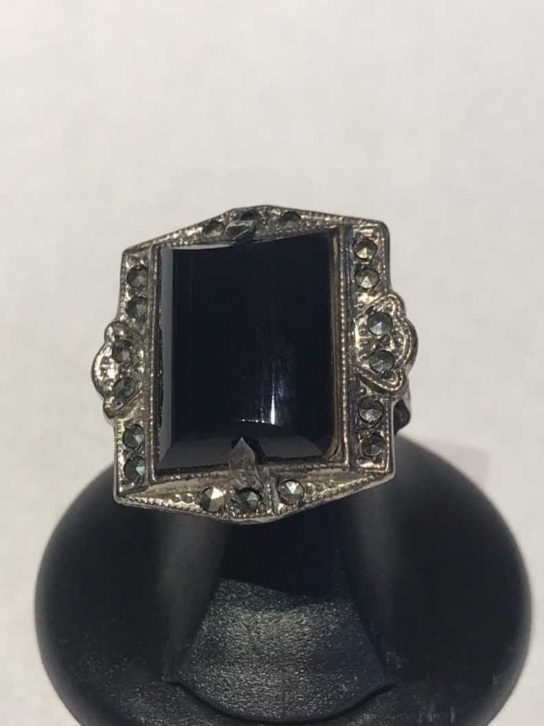 スクエアのオニキスと周りにマーカサイトを配した美しい指輪です。中古品ですので保管中の汚れ、小傷や擦れ、塗装の劣化、他製造過程のロス等ある場合がございます。