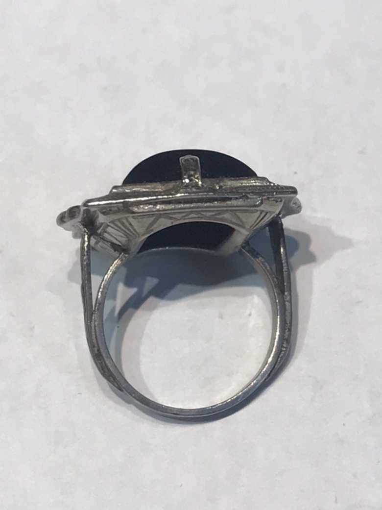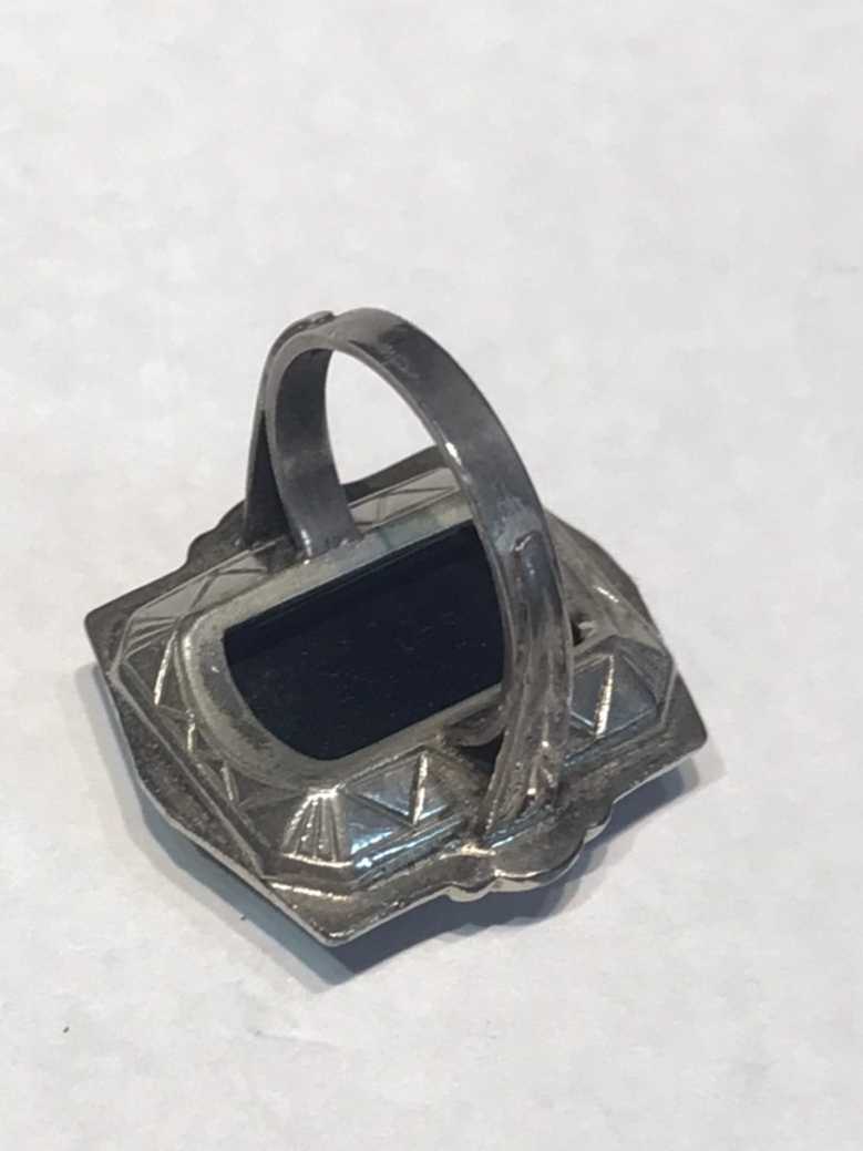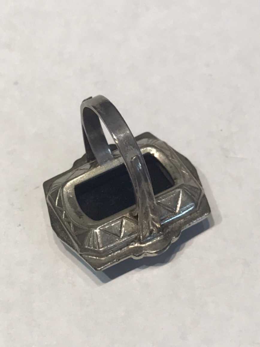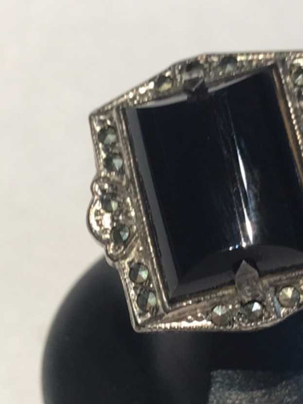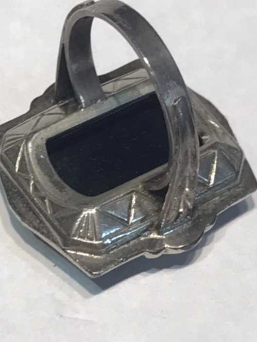 スクエアのオニキスと周りにマーカサイトを配した美しい指輪です。中古品ですので保管中の汚れ、小傷や擦れ、塗装の劣化、他製造過程のロス等ある場合がございます。