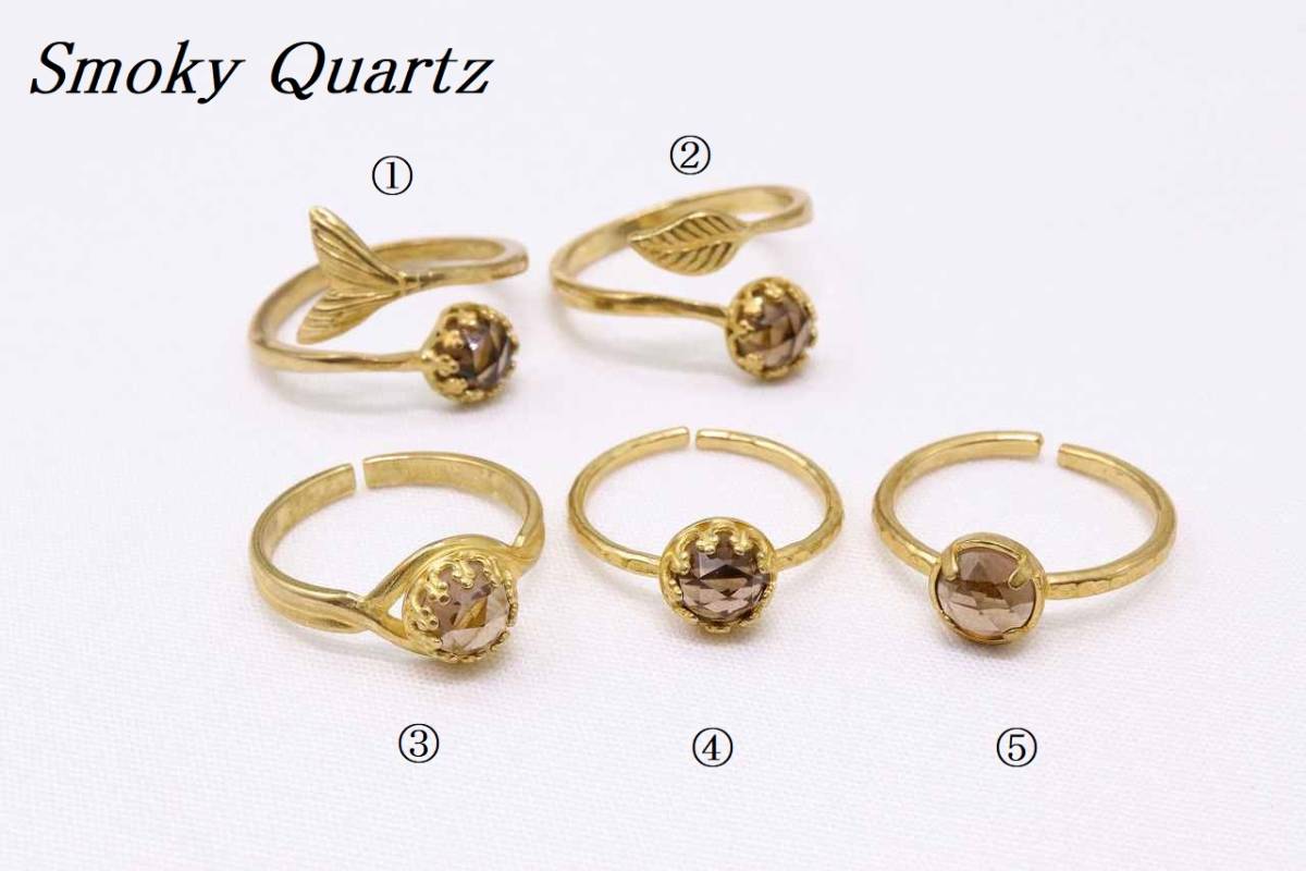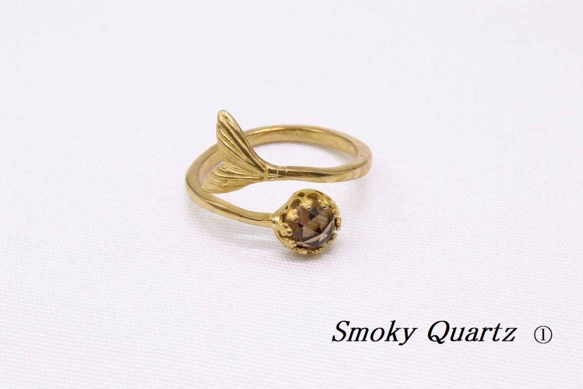 【★HR457①】天然石 スモーキークォーツ 尾びれ モチーフ 真鍮 リング 指輪 フリーサイズ パワーストーン 精神安定【送料全国一律198円】